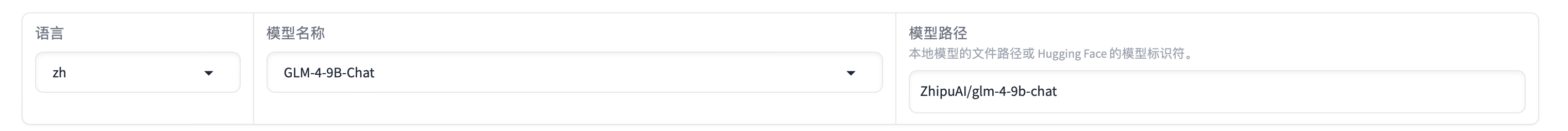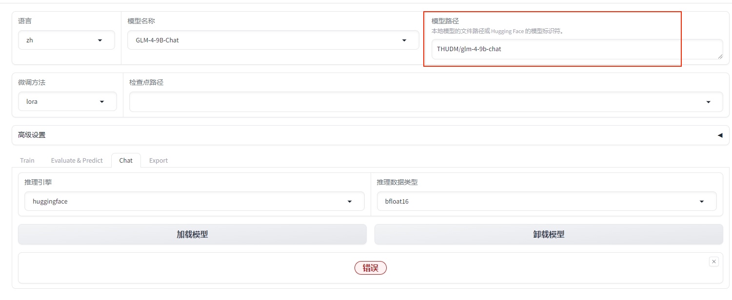 方式1: 加载本地模型的文件路径:如果已经提前下载模型文件,这里【模型路径】需要写下载模型路径的绝对地址(图中写的是THUDM/glm-4-9b-chat,非绝对路径)