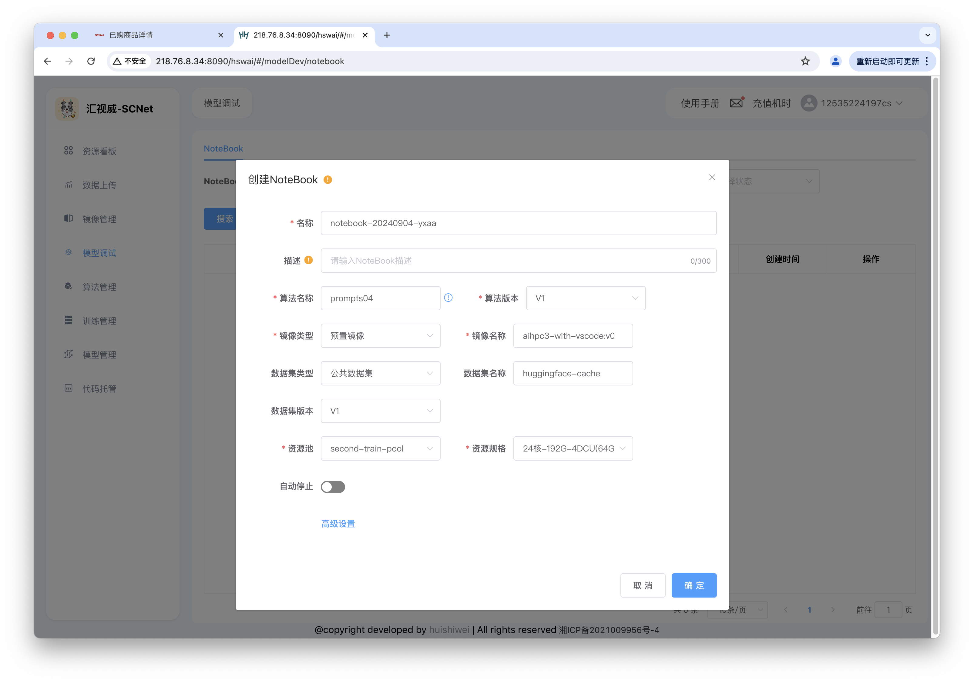 step2: 选择算法(prompts04)、镜像(aihpc3-with-vscode:v0)、数据集(huggingface-cache)创建notebook