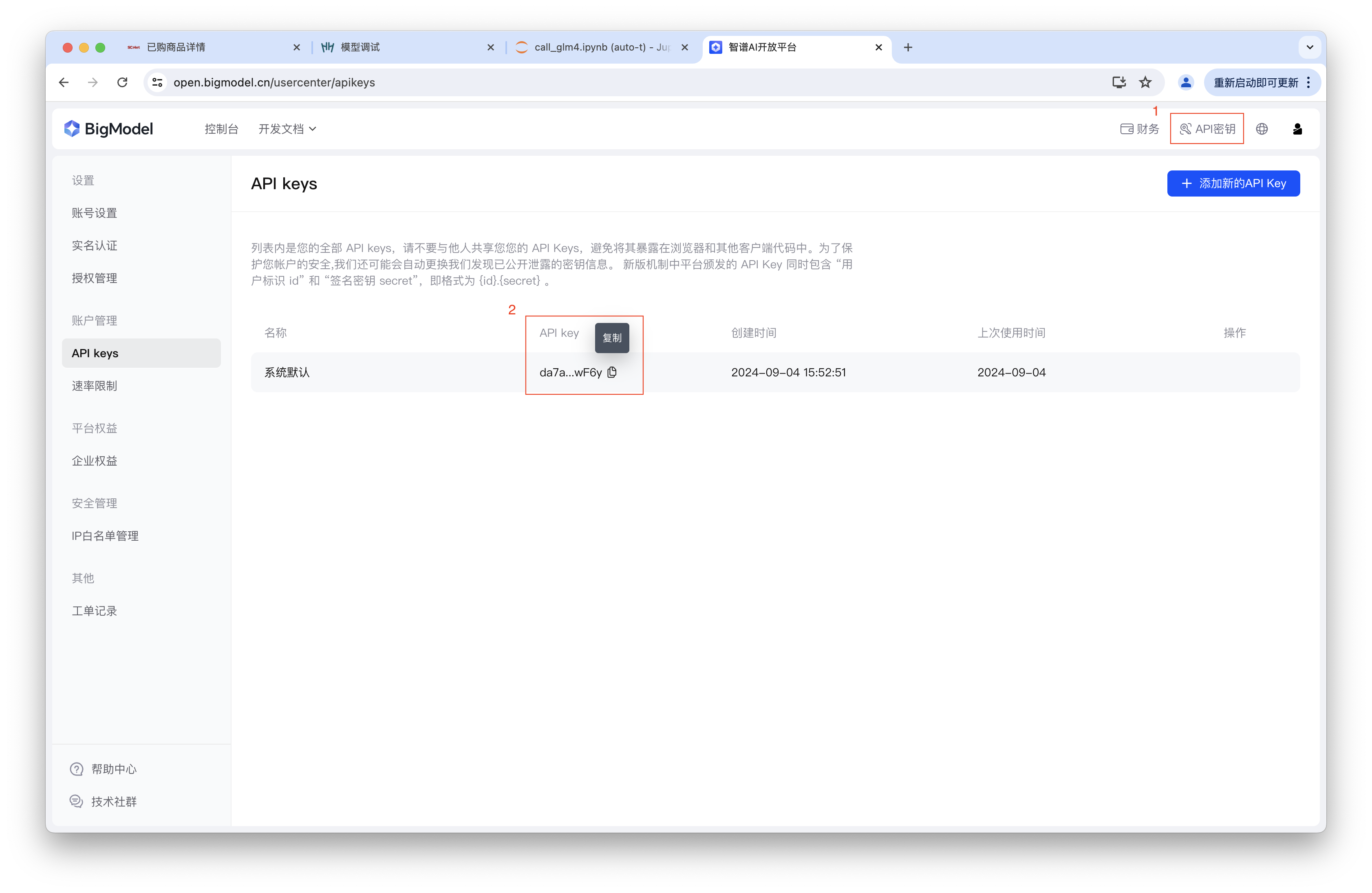 step2: 1.点击API密钥>2.复制API-key