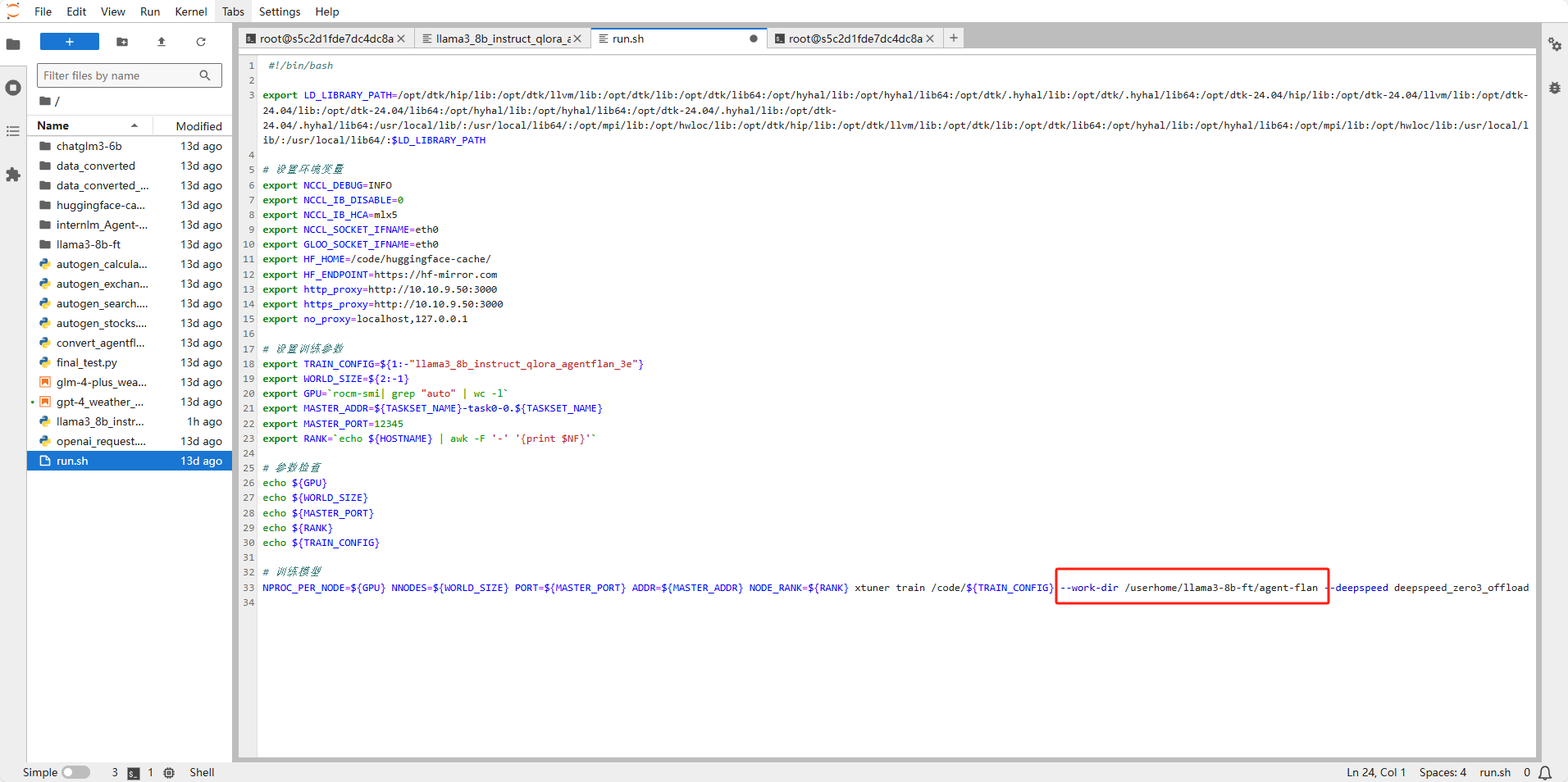 可以看到NPROC_PER_NODE=${GPU} NNODES=${WORLD_SIZE} PORT=${MASTER_PORT} ADDR=${MASTER_ADDR} NODE_RANK=${RANK} xtuner train /code/${TRAIN_CONFIG} --work-dir /userhome/llama3-8b-ft/agent-flan --deepspeed deepspeed_zero3_offload