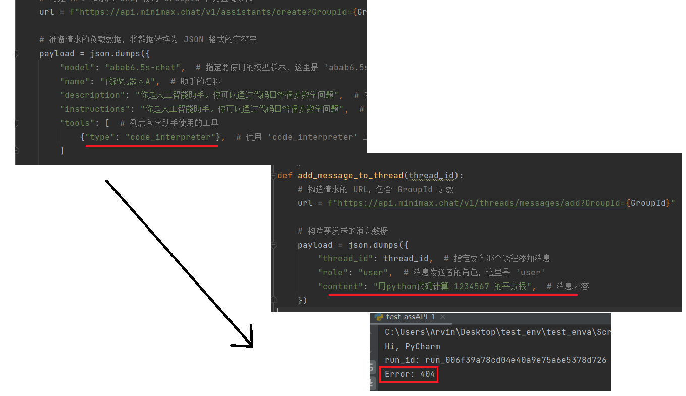 生成助手:create_assistant() 其中tool 工具选择了 :code_interpreter, 给定的消息内容是"用python代码计算 1234567 的平方根" 按照课程的思路,创建助手,生成线程thread、添加消息,然后运行RUN, 运行结果:404 (反复排查,原因不明)