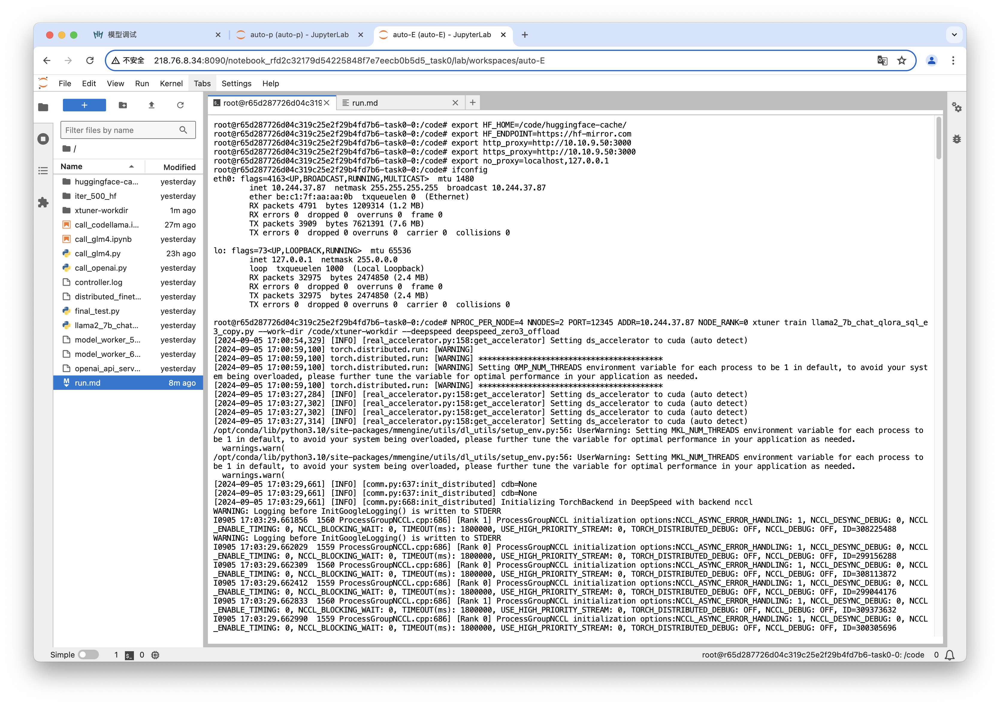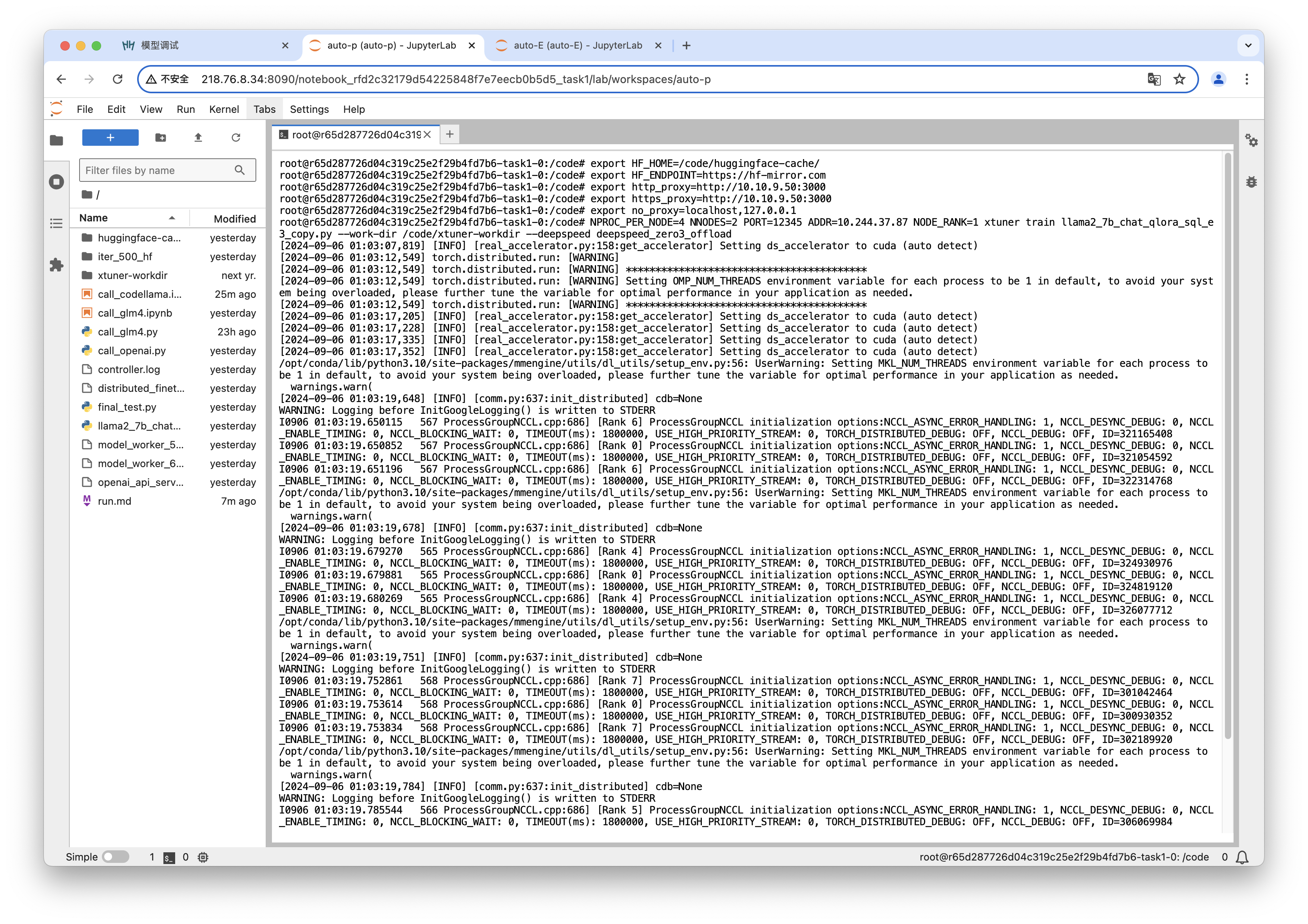 3、在task0运行:NPROC_PER_NODE=4 NNODES=2 PORT=12345 ADDR=10.244.37.87 NODE_RANK=0 xtuner train llama2_7b_chat_qlora_sql_e3_copy.py --work-dir /code/xtuner-workdir --deepspeed deepspeed_zero3_offload
