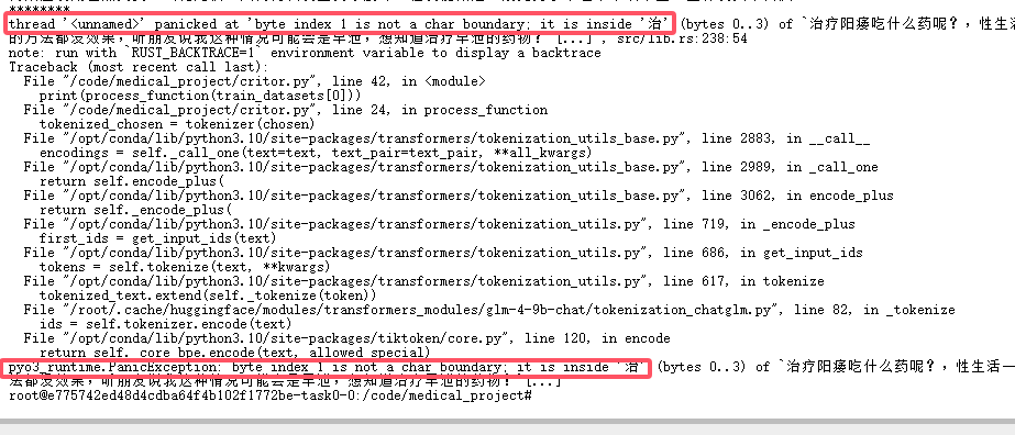 这里应该是中文导致的错误,tokenzier有两个实现,这里应该是rust的报错。可以在初始化tokenizer的时候将use_fast设置成false试一下。