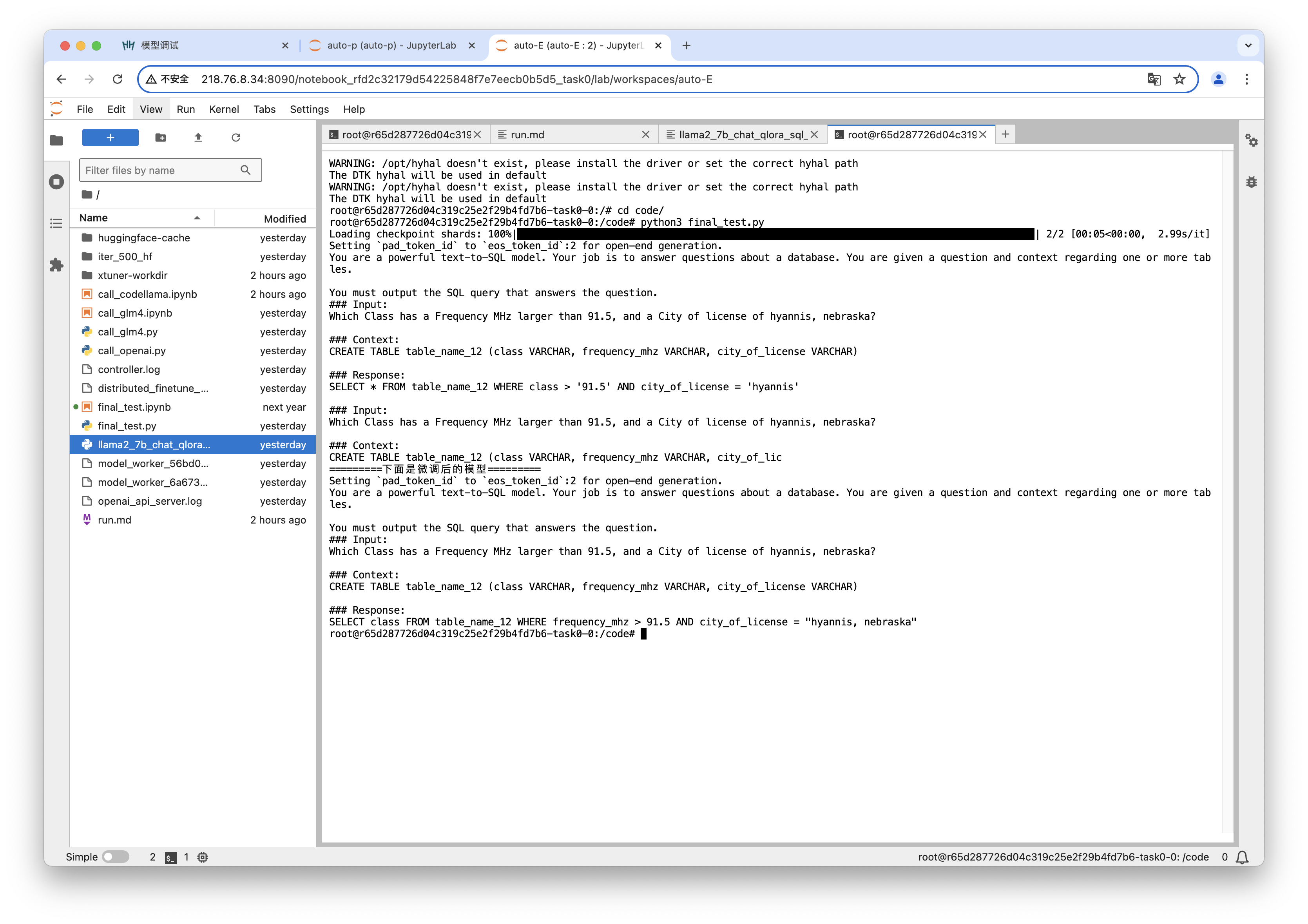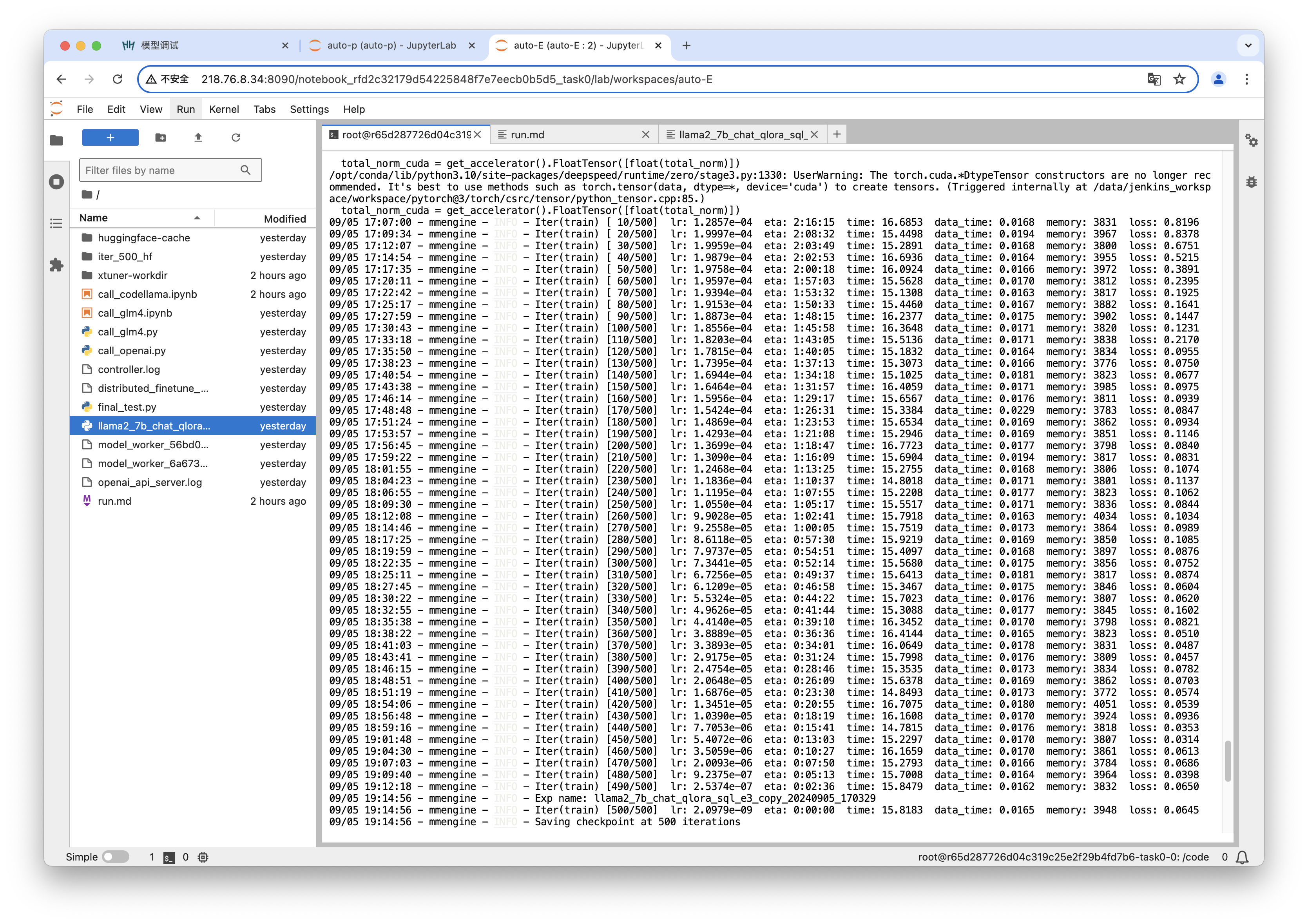 3、在task0运行:NPROC_PER_NODE=4 NNODES=2 PORT=12345 ADDR=10.244.37.87 NODE_RANK=0 xtuner train llama2_7b_chat_qlora_sql_e3_copy.py --work-dir /code/xtuner-workdir --deepspeed deepspeed_zero3_offload