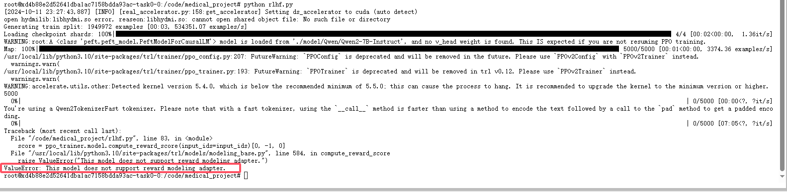 在进行RLHF微调任务中,训练完奖励模型之后,再进行PPO训练,出现的报错信息显示不支持刚刚训练的奖励模型再进行PPO训练,求助各位如何解决?是我的训练奖励模型出差错还是PPO训练出差错?(所有训练的基座大模型都是Qwen2-7b-instruct,actor和critic模型共用同一个基座大模型Qwen2-7b-instruct)。图1为报错信息,图2为训练奖励模型,图3为PPO训练,图4为训练好的奖励模型其中的ckpts #183