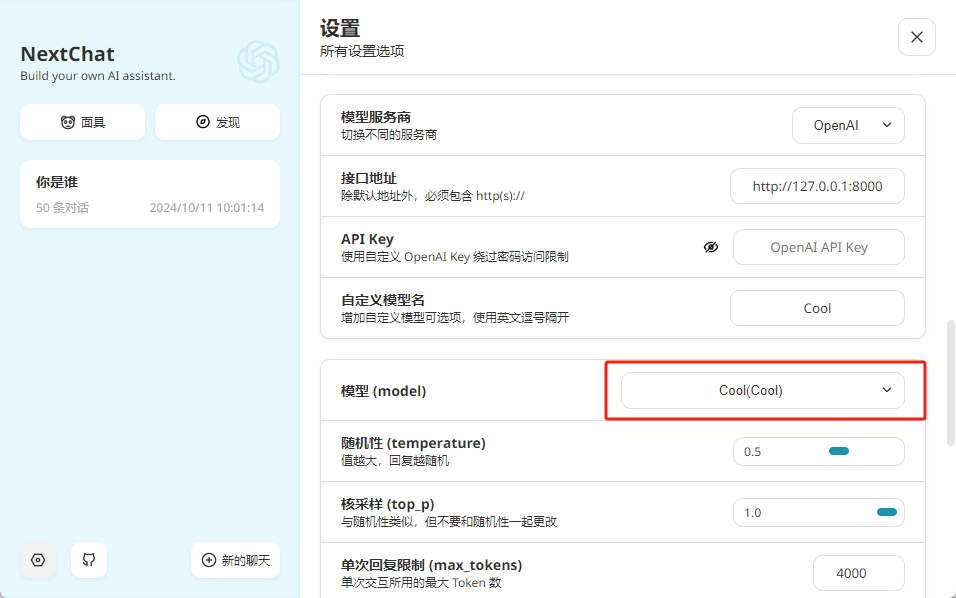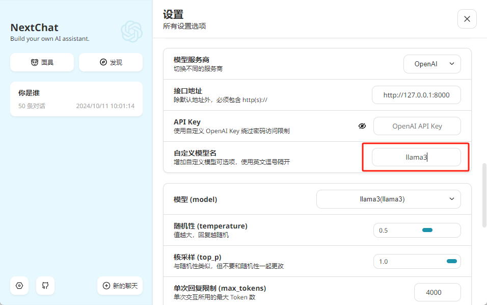 在完成大语言模型部署之后进行测试时,NextChat的模型选择里面没有llama3.
