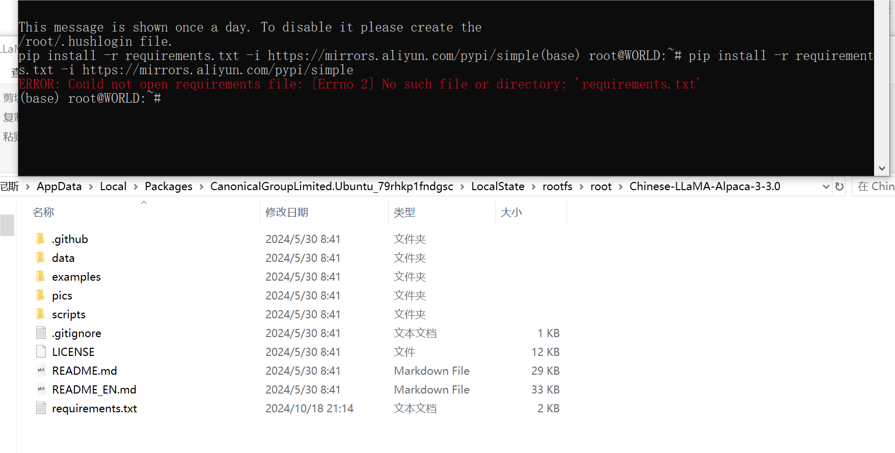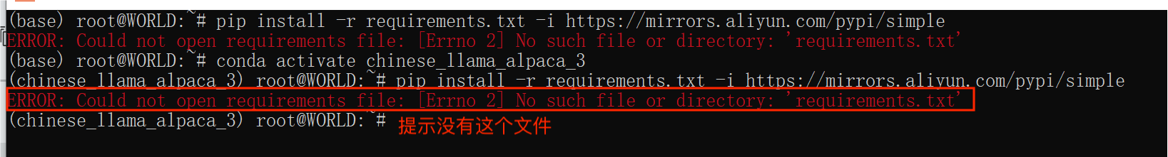 老师我检查了一下,requirements.txt文件已经存在\root\Chinese-LLaMA-Alpaca-3-3.0目录下了但是依然无法正常运行