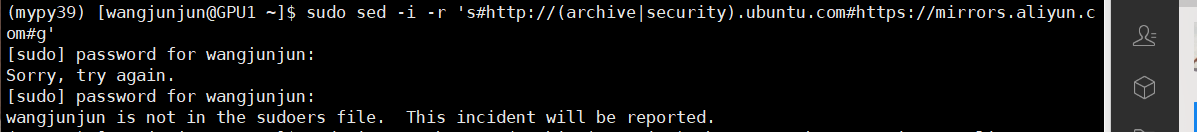 第二张图代表着用户wangjunjun没有在sudoers文件中被授权使用sudo命令,因此无法执行需要管理员权限的操作。