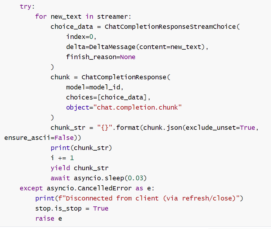 在上周三的Chinese LLaMA Alpaca系列模型OpenAI API调用实现课程中,GPU释放问题部分,我原封不动的粘贴了老师的代码,并且在try代码中,打印了chunk_str,当我在NextChat中点击停止的时候,并没有触发except asyncio.CancelledError as e,然后停止,而是一直打印chunk_str直到最后一个字输出,NextChat点击暂停触发的是什么事件呢?这个except asyncio.CancelledError as e应该改成什么呢