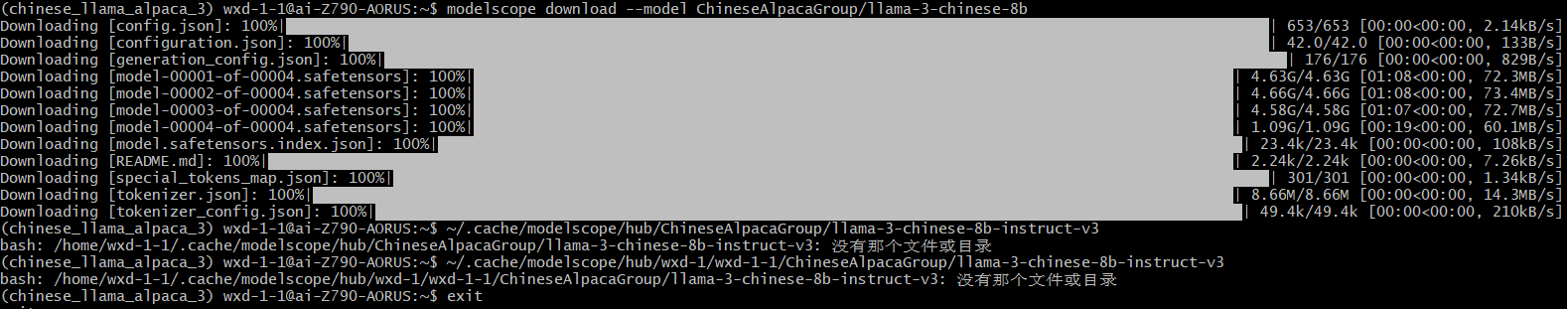 这边建议你使用modelscope download --model ChineseAlpacaGroup/llama-3-chinese-8b --output /path/to/your/directory/来指定你下载的文件的路径。