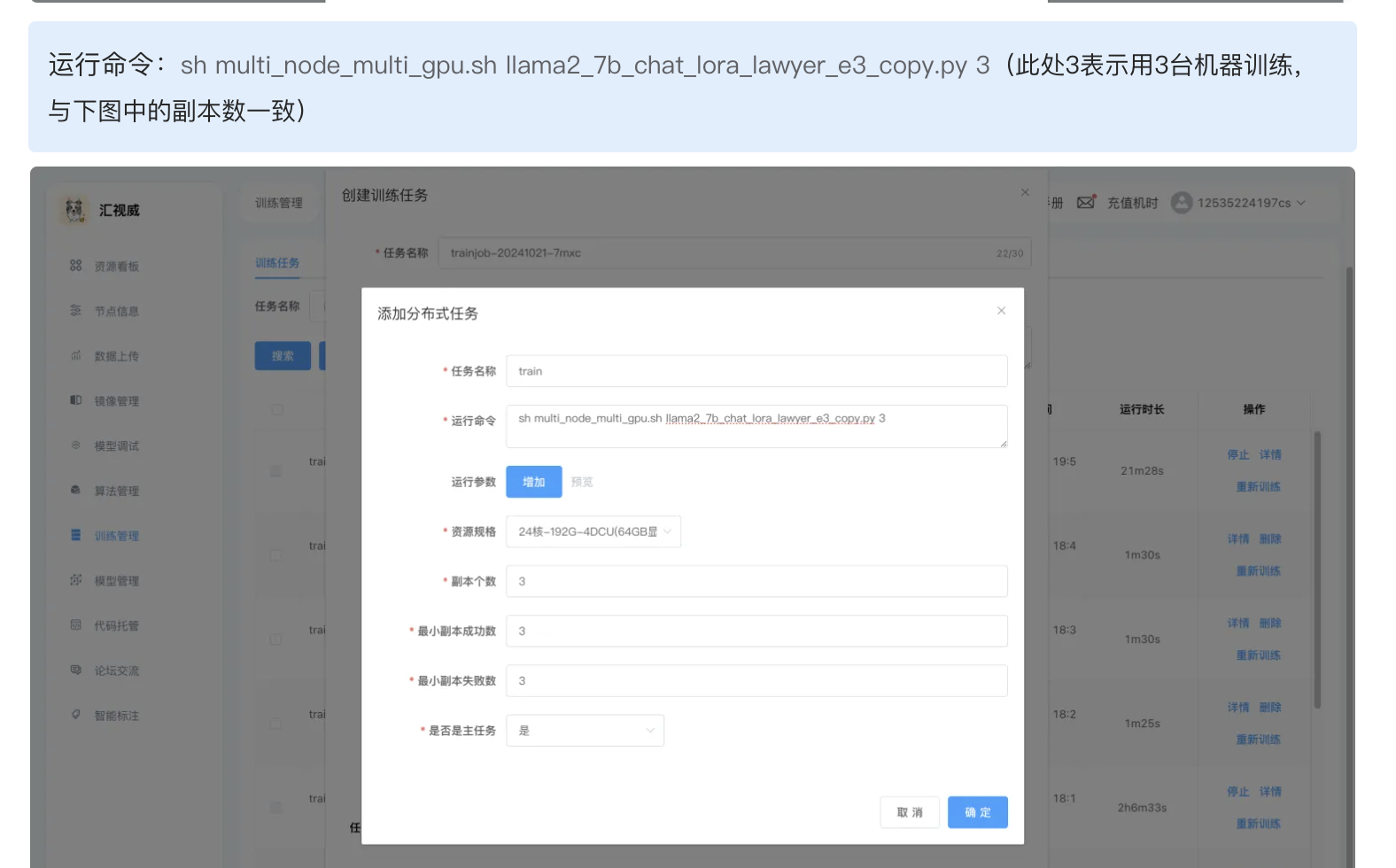 NODE_NUM赋值给NNODES就是NNODES的含义,之前WORLD_SIZE赋值给NNODES就是NNODES的含义(文档已改),在【模型调试】中,一个task可以理解成启用了一台机器,在【训练管理】处,几个副本代表几台机器,下图为操作文档中的说明