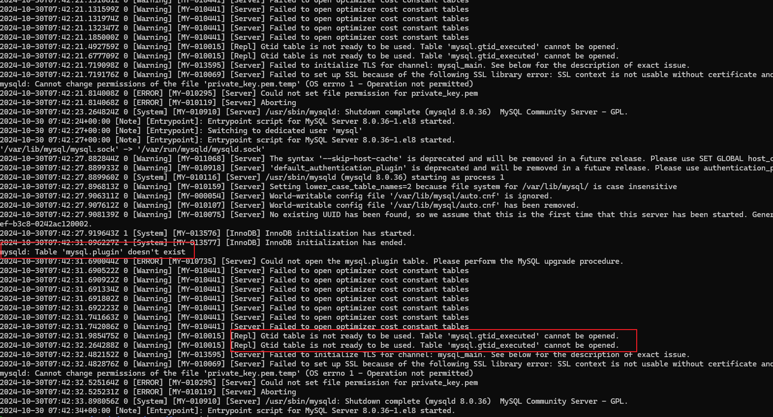 mysqld: Cannot change permissions of the file 'private_key pem. temp' (OS errno 1 - Operation not permitted)这个目录没有权限,建议修改目录权限或者换个有权限的目录试一下