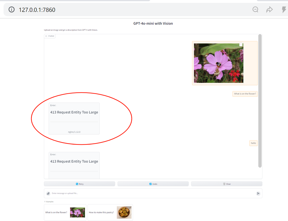 在10月26日基于图片的智能信息检索问答-基德老师的课件中,gradio_gpt4o.py,将此程序在我的本地PC pycharm上运行,生成web页面之后,在对话交互时,出现错误,“413 Request Entity Too Large”,如截图所示,请问如何解决啊?