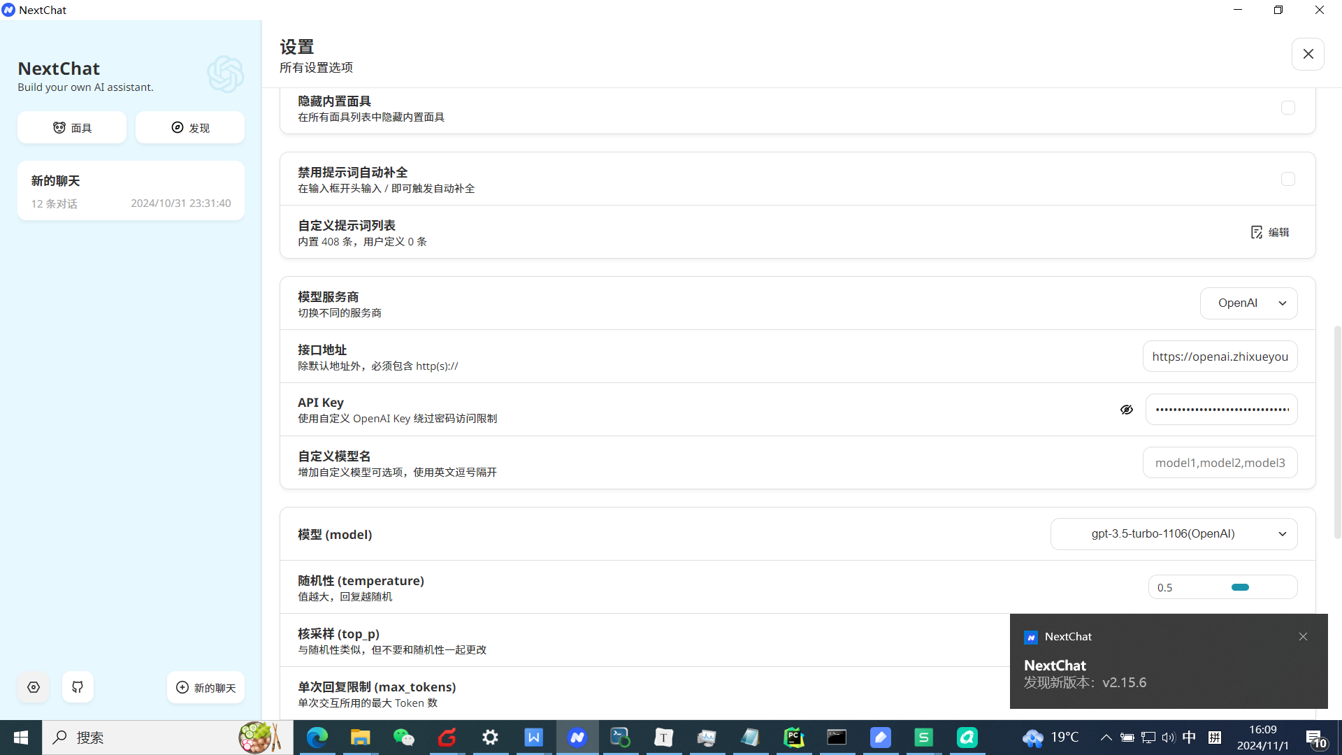 2、nextchat 设置访问 接口为:https://openai.zhixueyouke.cn/v1/ , API KEY 设置为 之前老师给的密码,无法访问。同样的参数,通过pycharm 代码可以访问