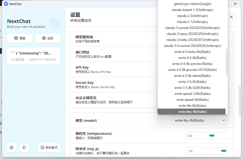 但是我用百度的ERINE模型的时候找不到接口地址,用GLM的时候不知道NEXTCHAT是不支持调用还是怎么的,在模型里面找不到他。我也要求助一下老师~