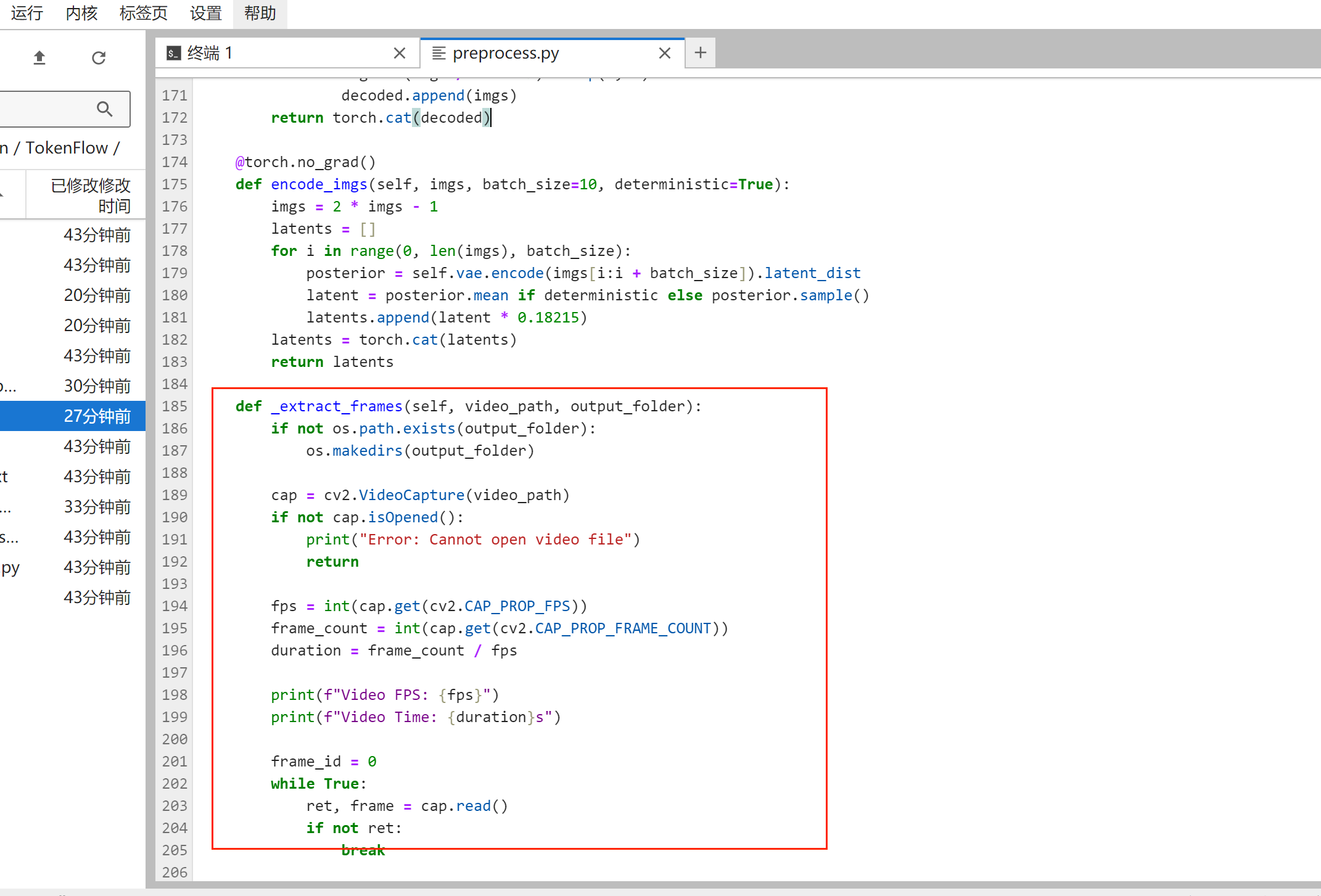 报错的原因是torchvision在写入视频的时候有bug,把preprocess.py的332行左右的write_video的内容注释,然后在下面添加如上代码即可