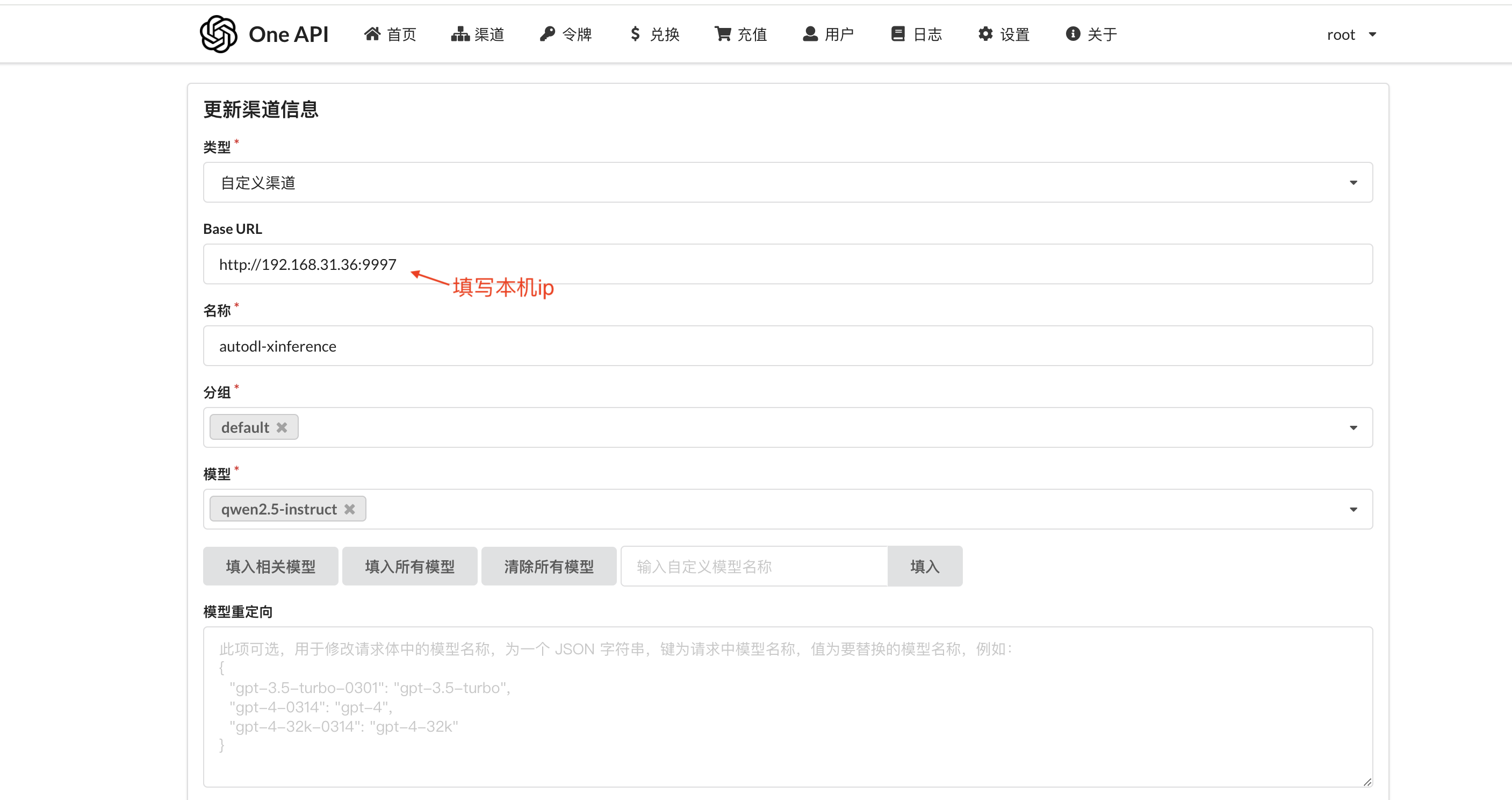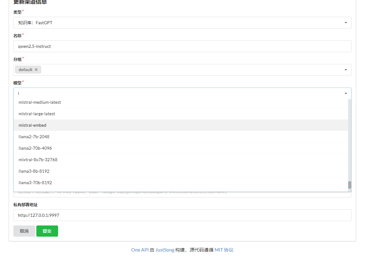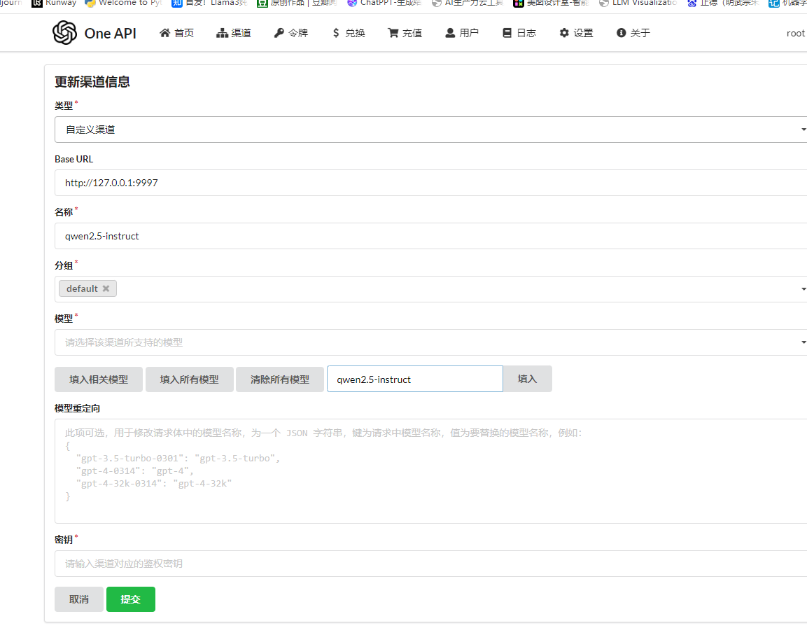 2、oneapi配置页面没有llama3.1模型供选择,所以我只有自己填了一个qwen2.5-instruct;