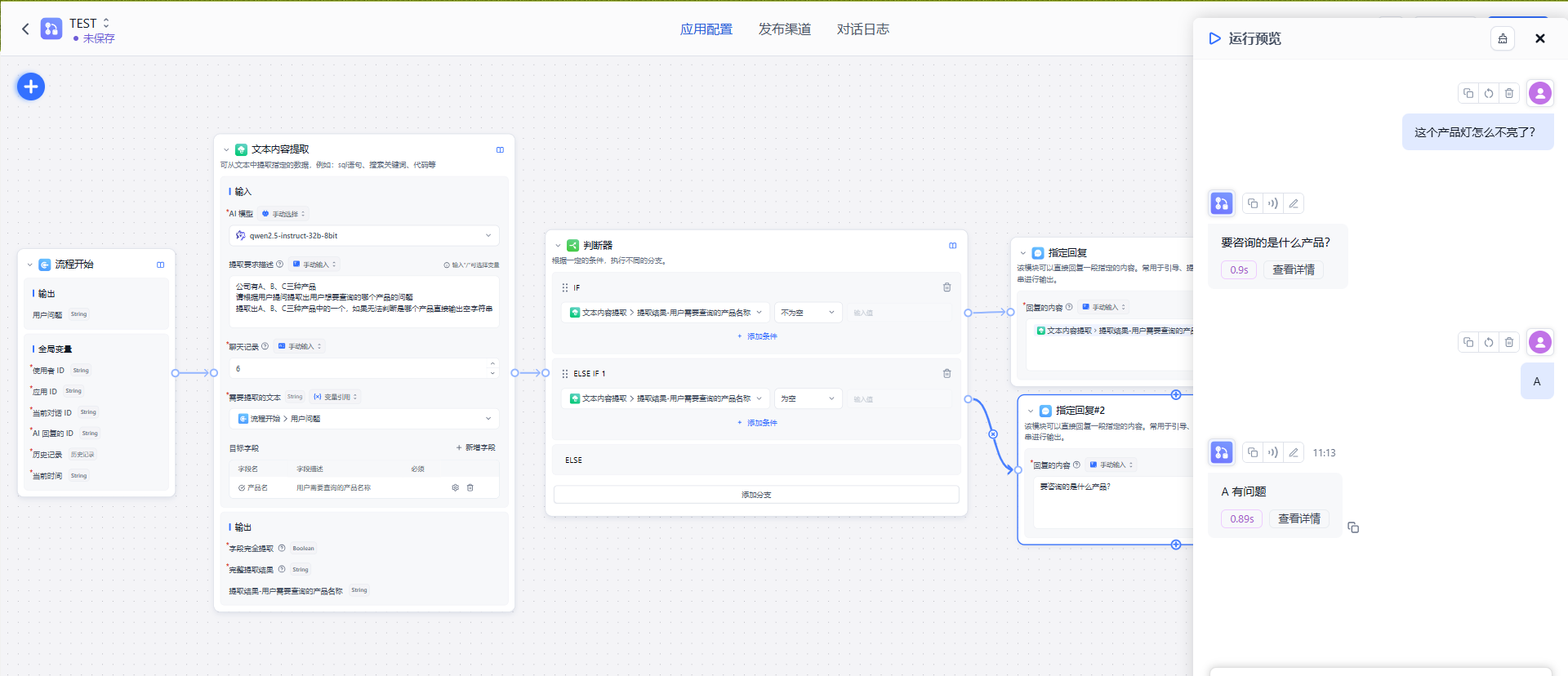 此时该流程生效,能根据问题分配有效的匹配到对应的工作流上,并生成答案。