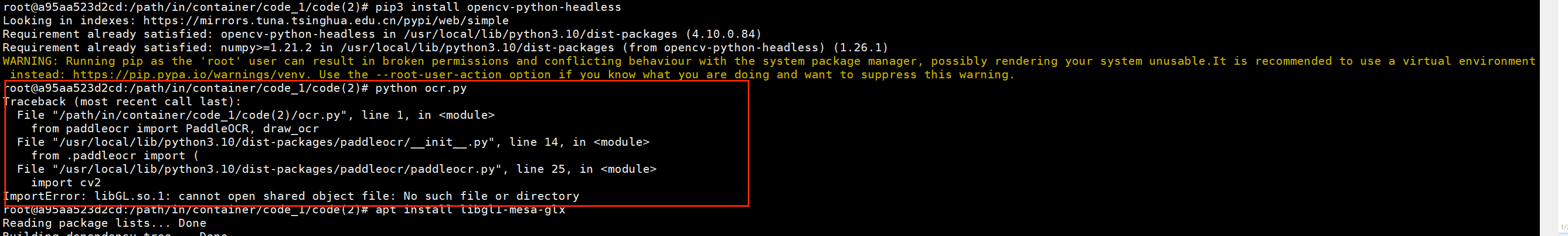 安装第二种方式安装的paddleocr,在容器中运行示例ocr.py时报错如下