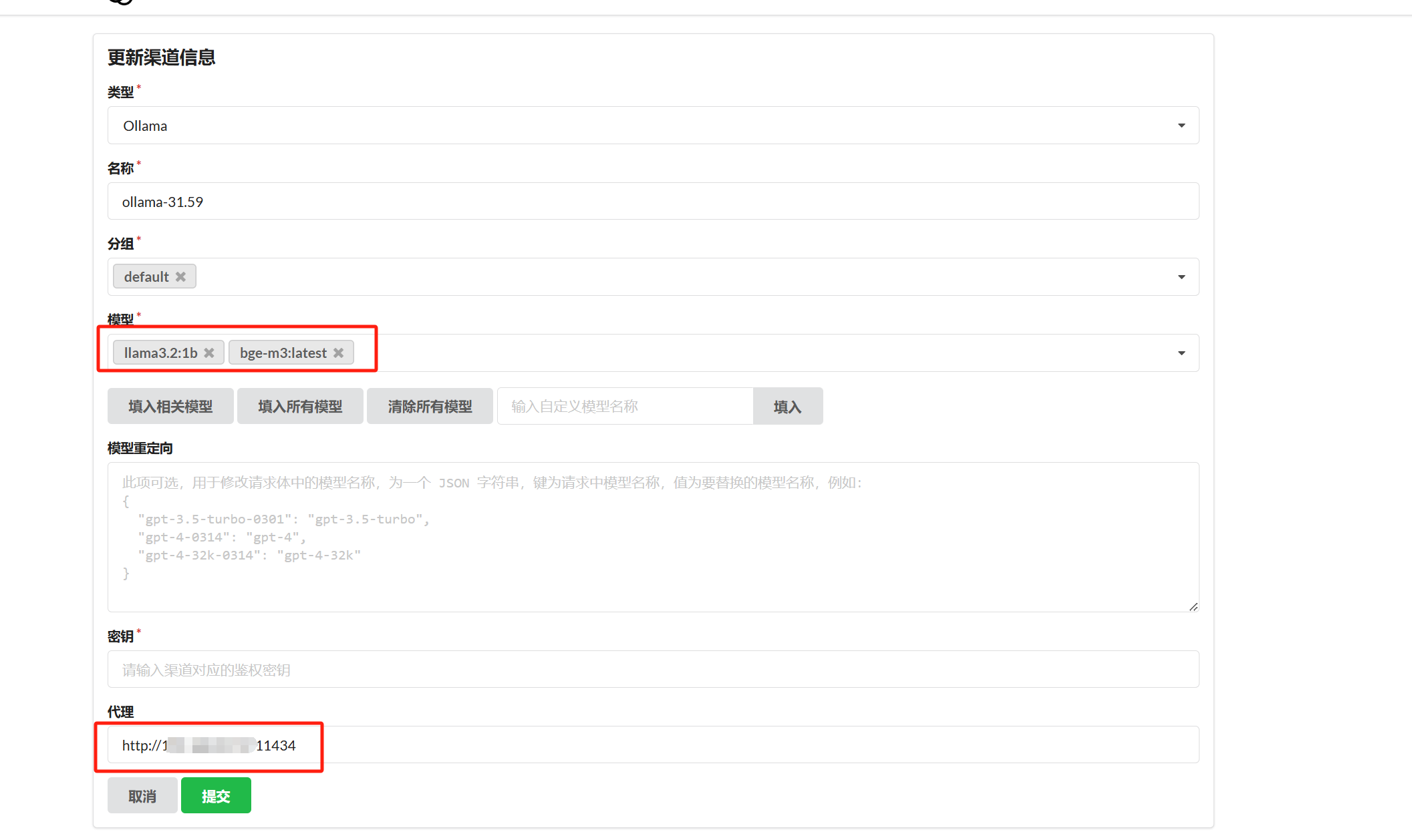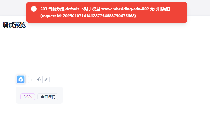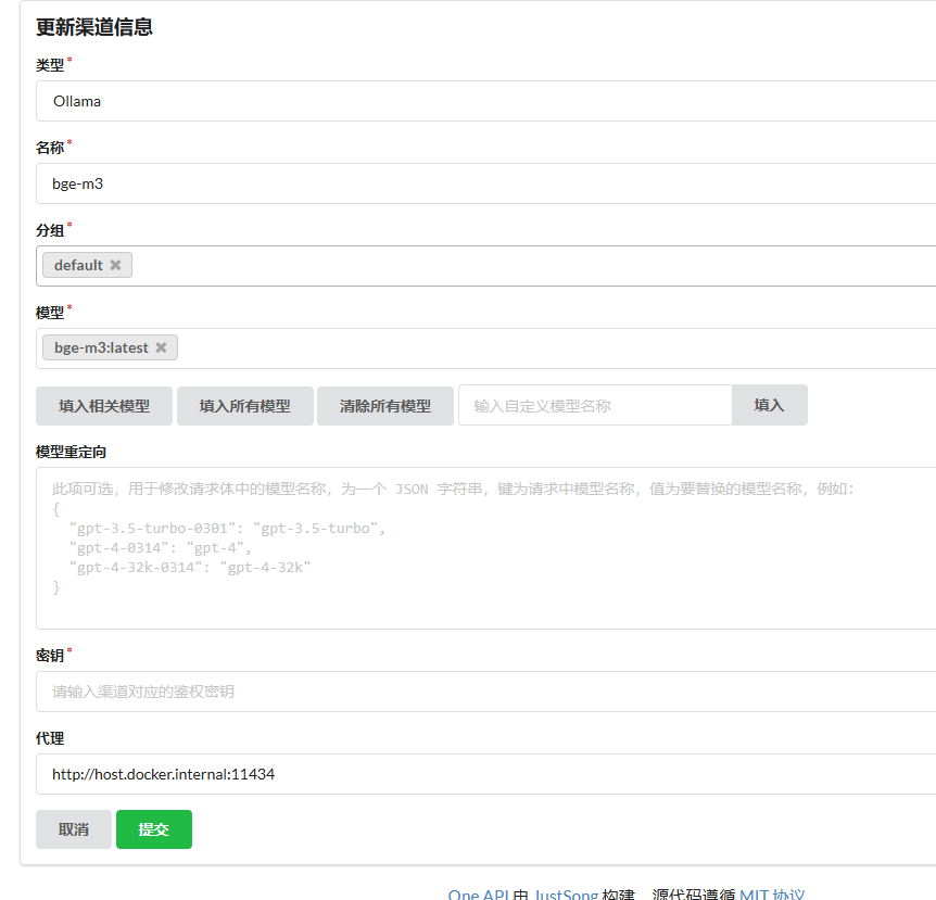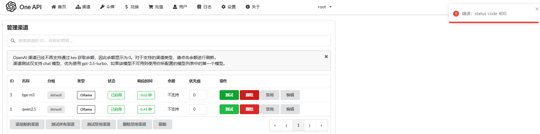 fastgpt在创建通用知识库时找不到索引模型,报错text-embedding-002无可用渠道,于是我又去ollama手动下载了其他的嵌入模型但是加入oneapi的时候都是测试不通过,请问应该怎么解决