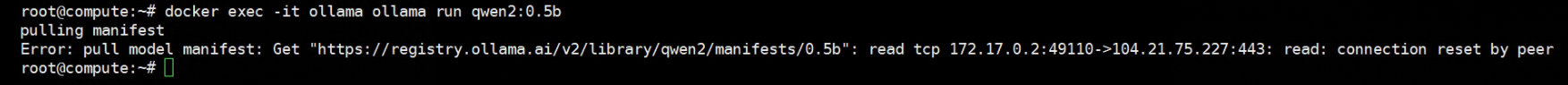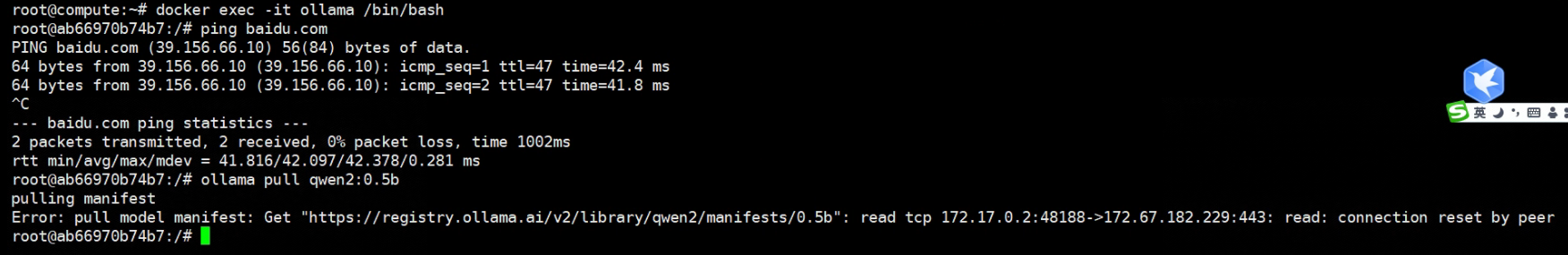 老师你好,我在本地服务器(安装ubuntu22.04)中安装docker引擎后,创建了一个ollama容器(cpu模式),但是进入容器后拉模型时报错如下: