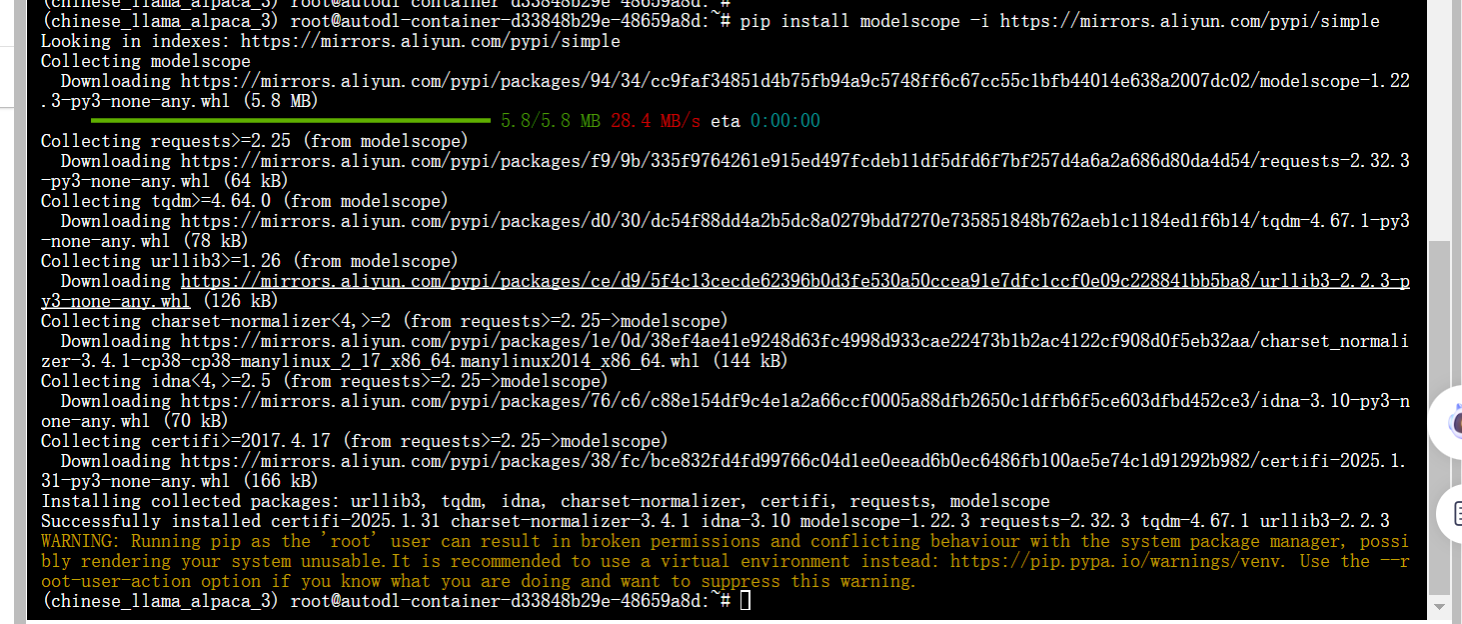 2.因为无法创建用户,于是用root用户安装,激活环境后,下载模型
