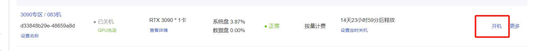 3.关机后,再开机,gpu资源不充足怎么办呢?图片是正好充足,如图5,有一次是没有gpu资源的,由于当时安装操作过少,我直接重租了个服务器。假如以后安装完,需要使用时,再开机,显示资源不足怎么办呢?