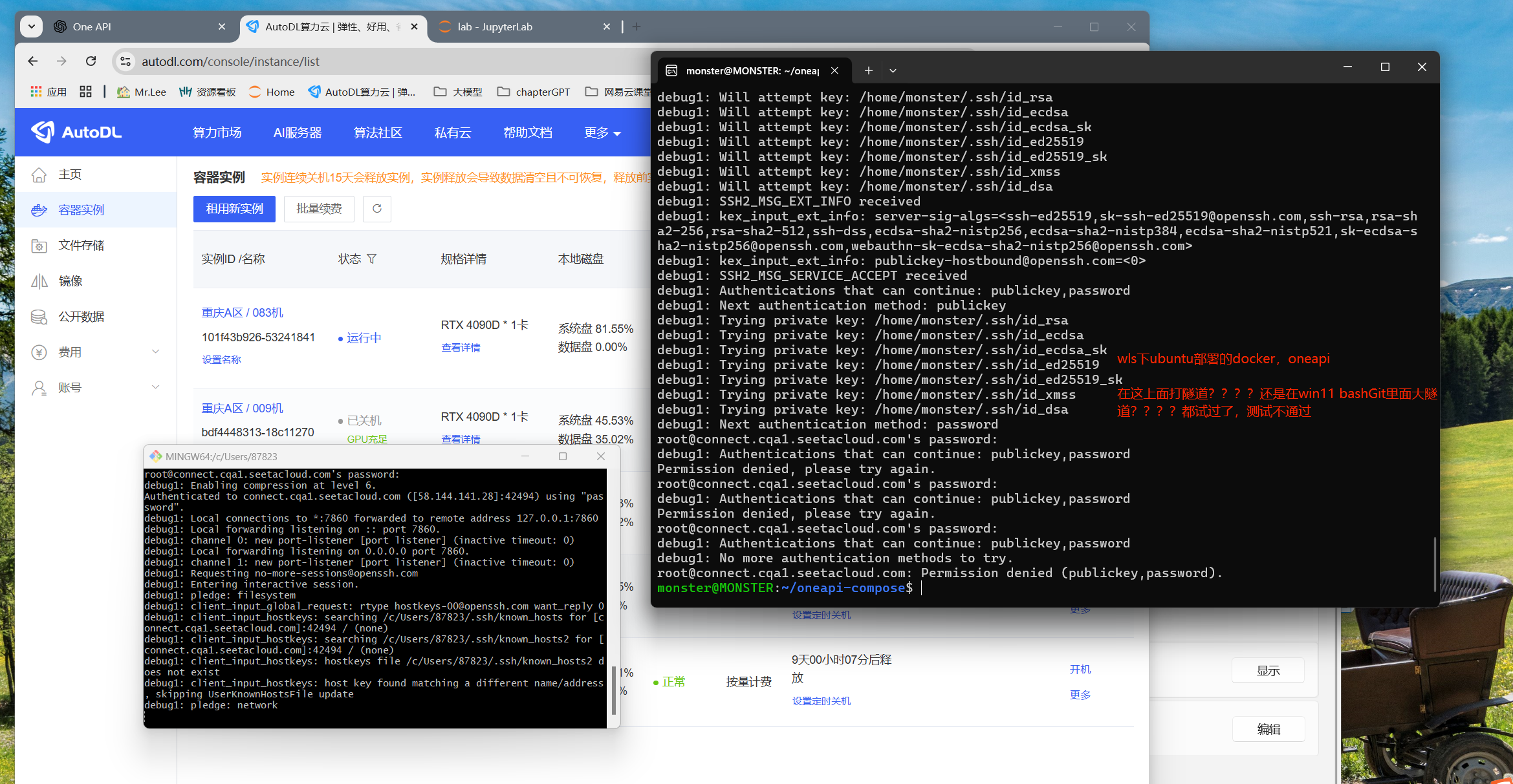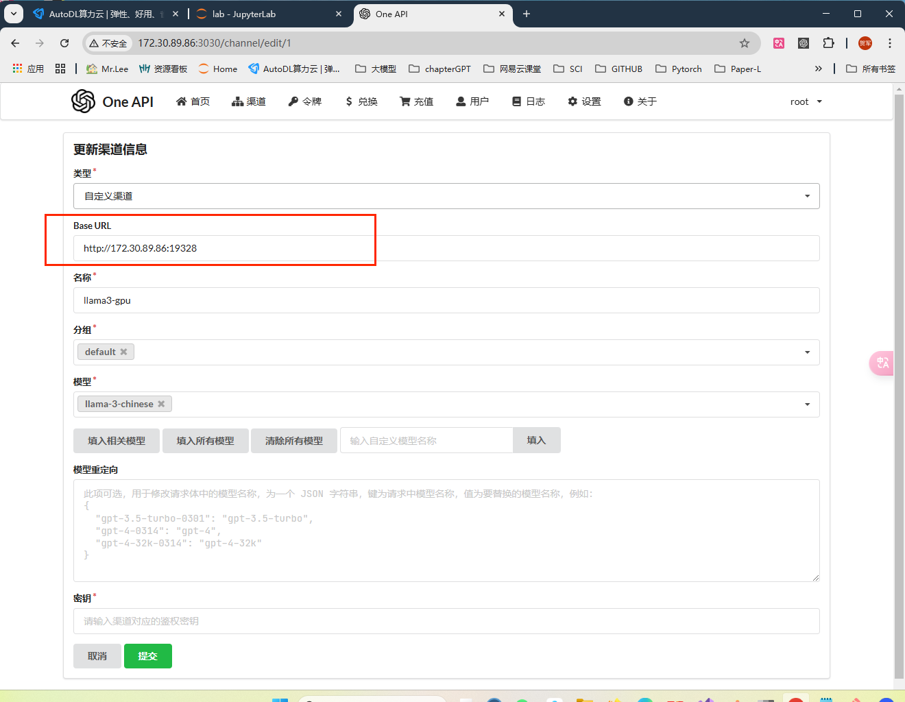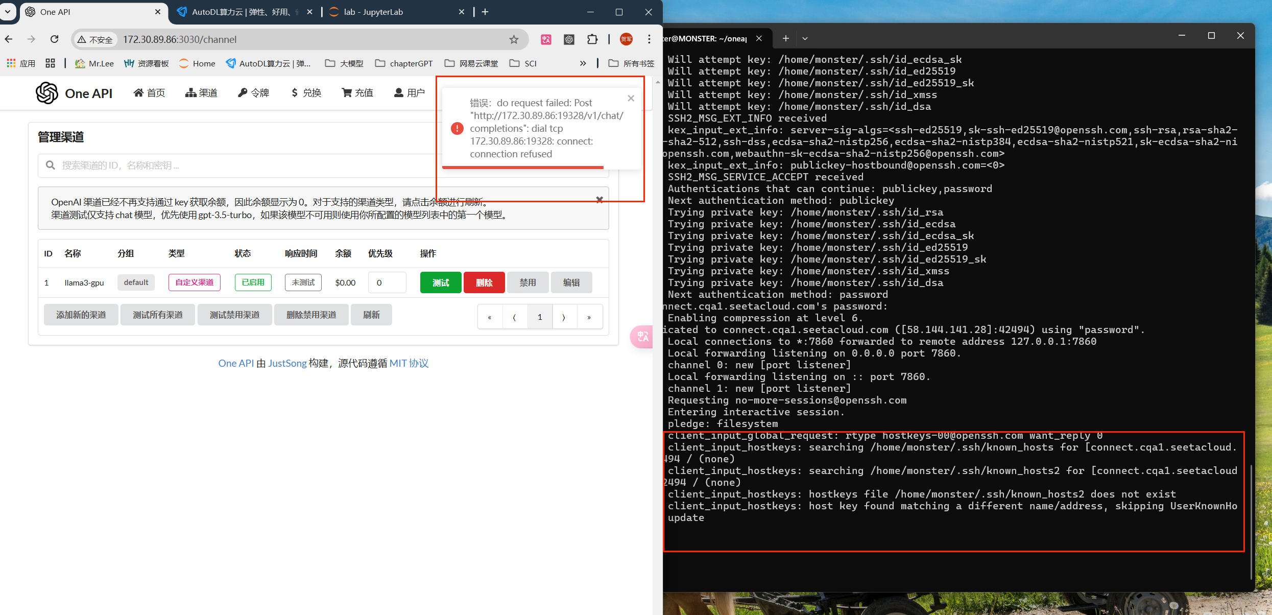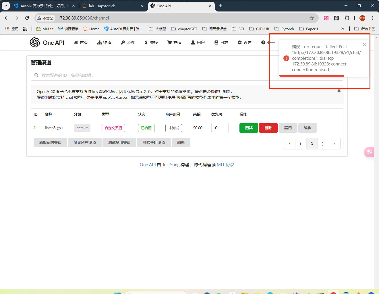 首先在autoDL成功开启了模型服务,然后在win11通过wsl ubuntu22 部署oneapi,测试渠道可用性失败!