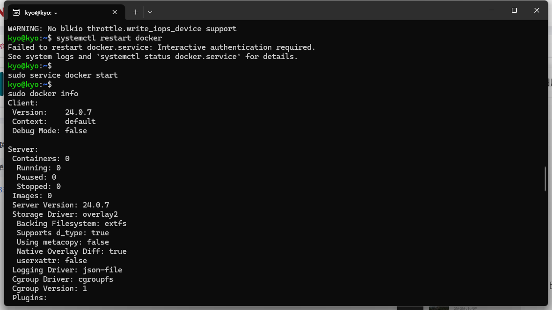 sudo service docker start #启动docker服务 sudo docker info #查看docker信息如果有以下打印信息说明docker启动正确: