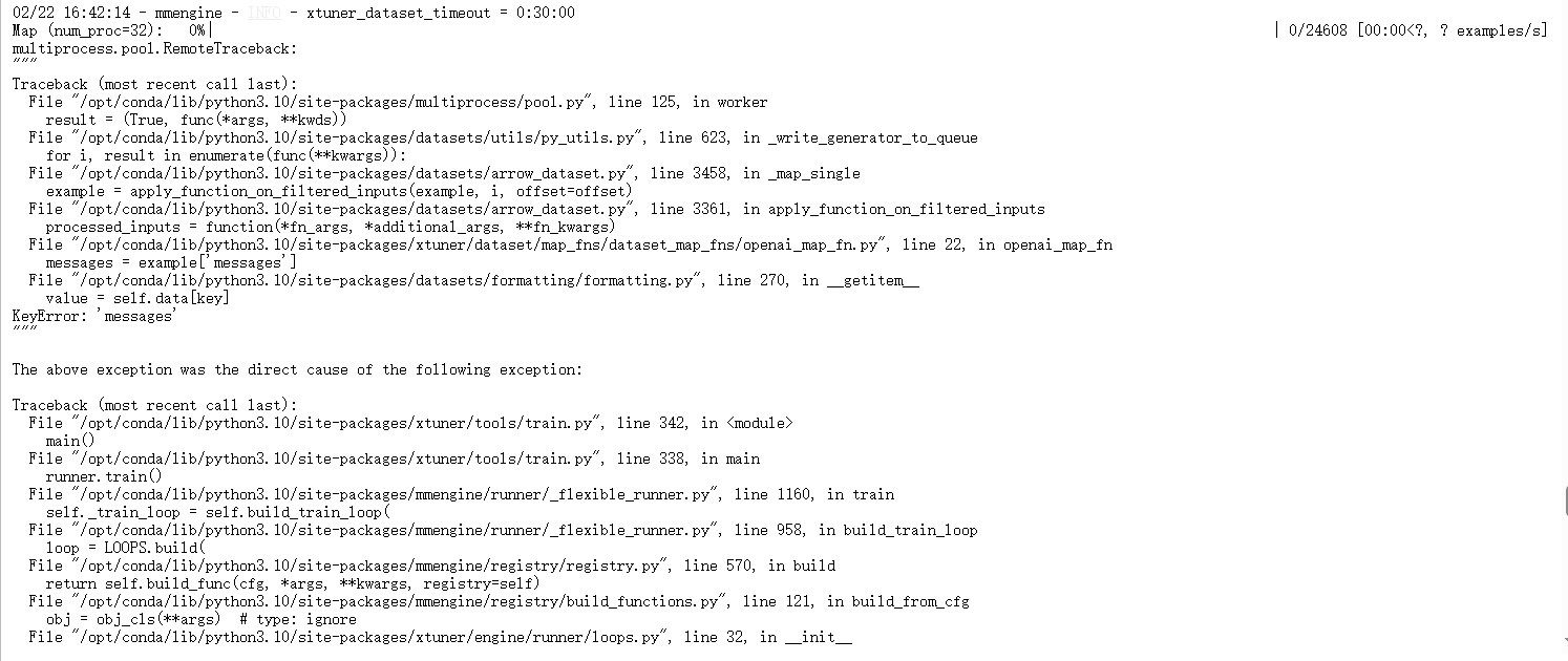 在平台上xtuner遇到报错to [求助帖】在平台上xtuner遇到报错可能是你的数据集修改的代码和训练使用的数据集格式不一致,报错说数据集的例子里面没有"messages",可能你的数据集代码构造没有构造messages。
