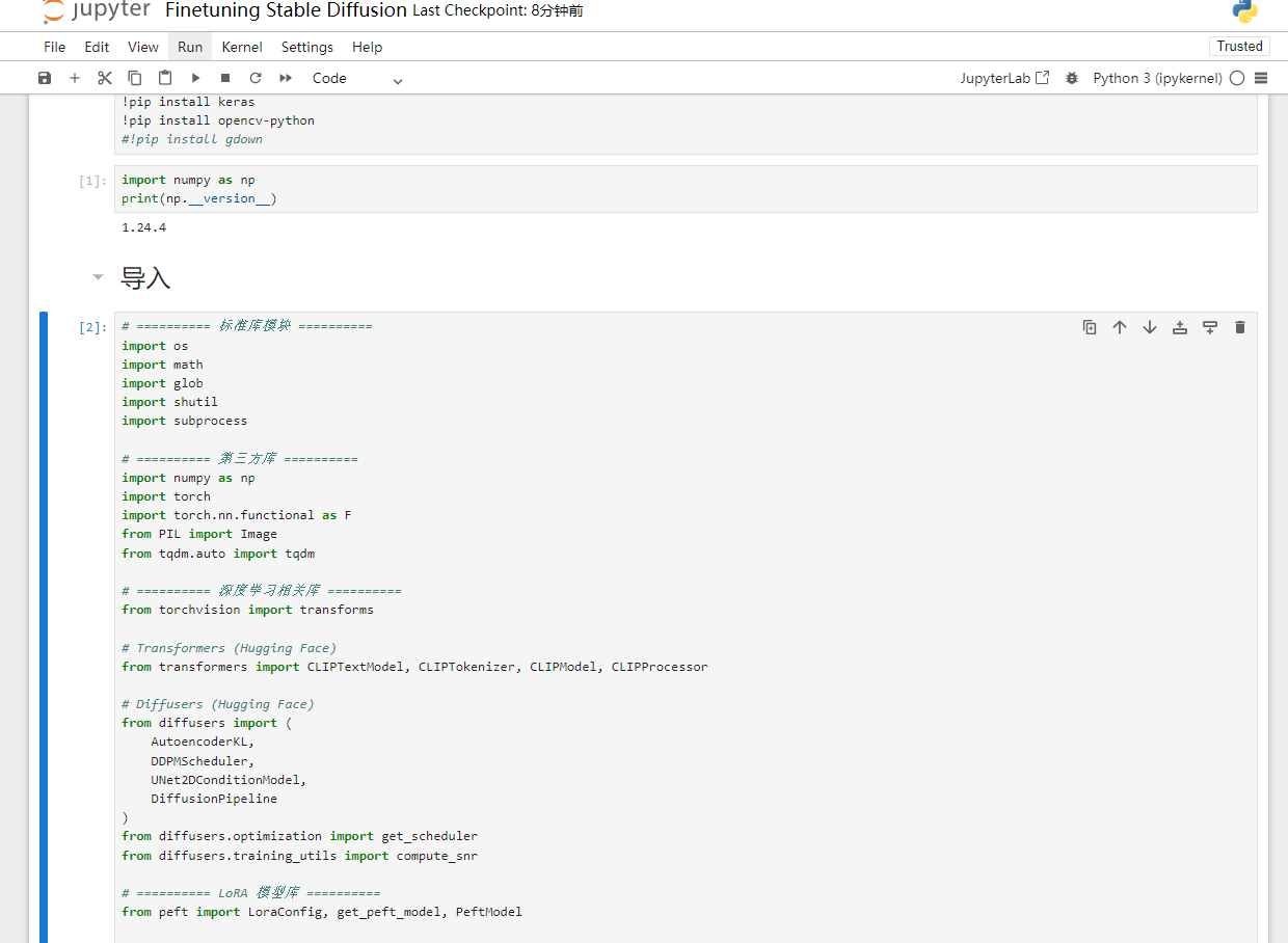 stable diffusion微调的环境问题,因为jupyter下载依赖默认下载每个依赖的最新版本,不会考虑依赖包之间的兼容,因此需要改成基于pip install -r requirements.txt下载,请大家去百度网盘重新下载FinetuningStableDiffusion.ipynb和requirements.txt,然后再尝试一下
