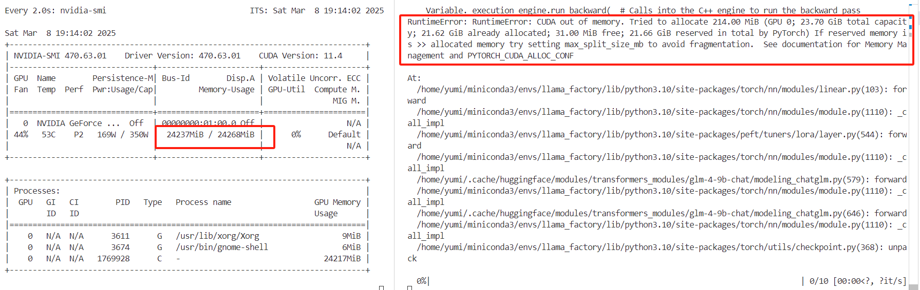 报错 OOM,RuntimeError: RuntimeError: CUDA out of memory. Tried to allocate 214.00 MiB (GPU 0; 23.70 GiB total capacity; 21.60 GiB already allocated; 59.00 MiB free; 21.63 GiB reserved in total by PyTorch) If reserved memory is >> allocated memory try setting max_split_size_mb to avoid fragmentation. See documentation for Memory Management and PYTORCH_CUDA_ALLOC_CONF