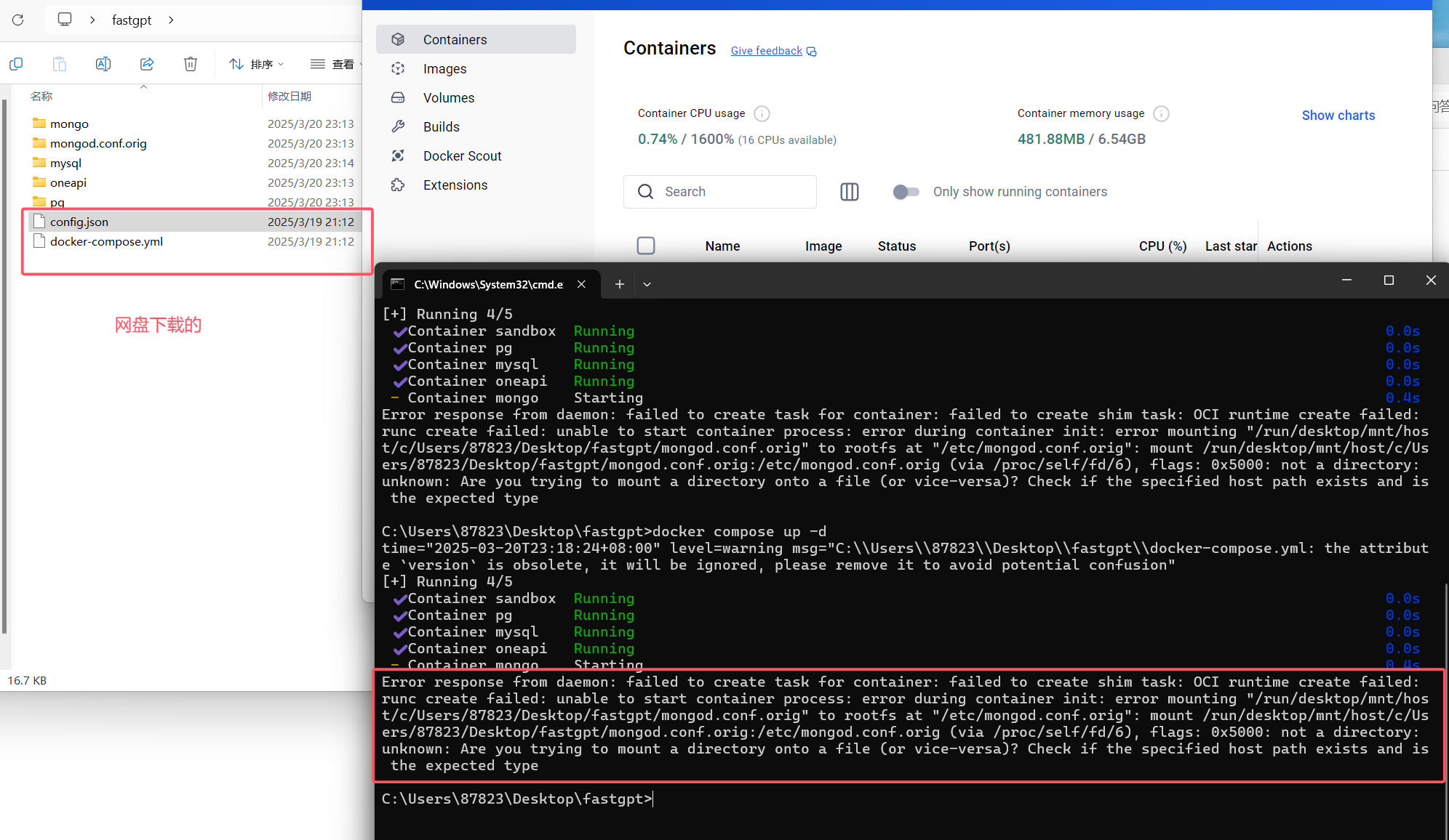 这个是由于fastgpt的docker-compose.yml文件没有完全适配Windows版本的docker,只需要将docker-compose.yml文件的第42行注释掉,如下图所示: