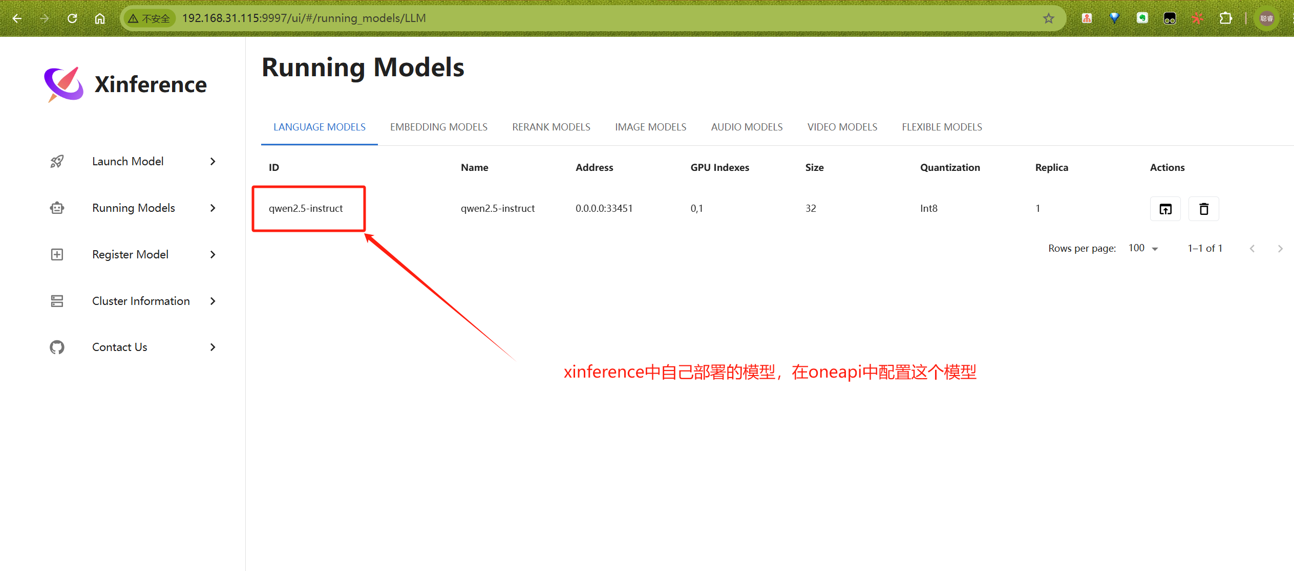 可以在"输入自定义模型名称"的输入框中直接复制xinference中你部署的模型,然后点击"填入"按钮就可以配置自己的模型,