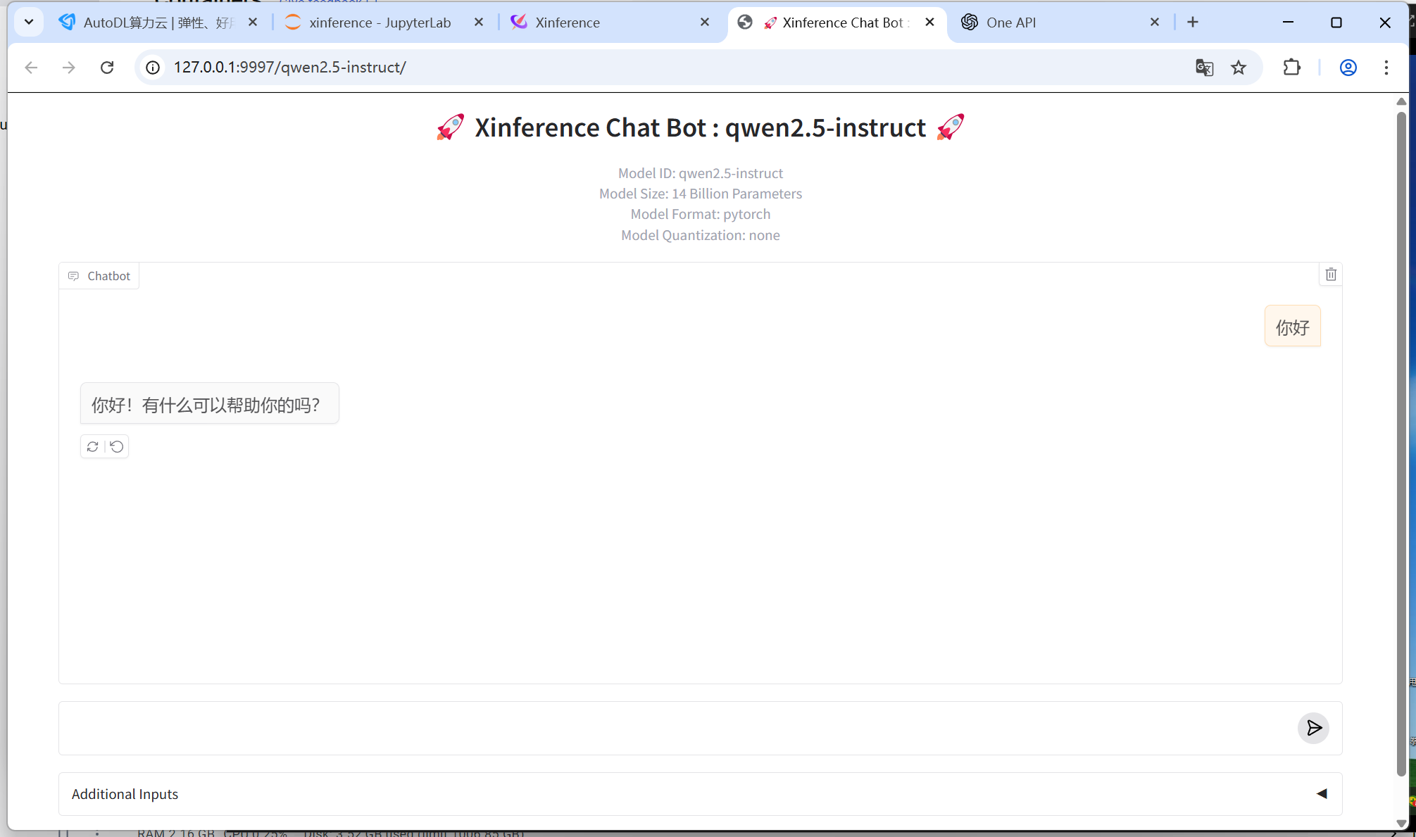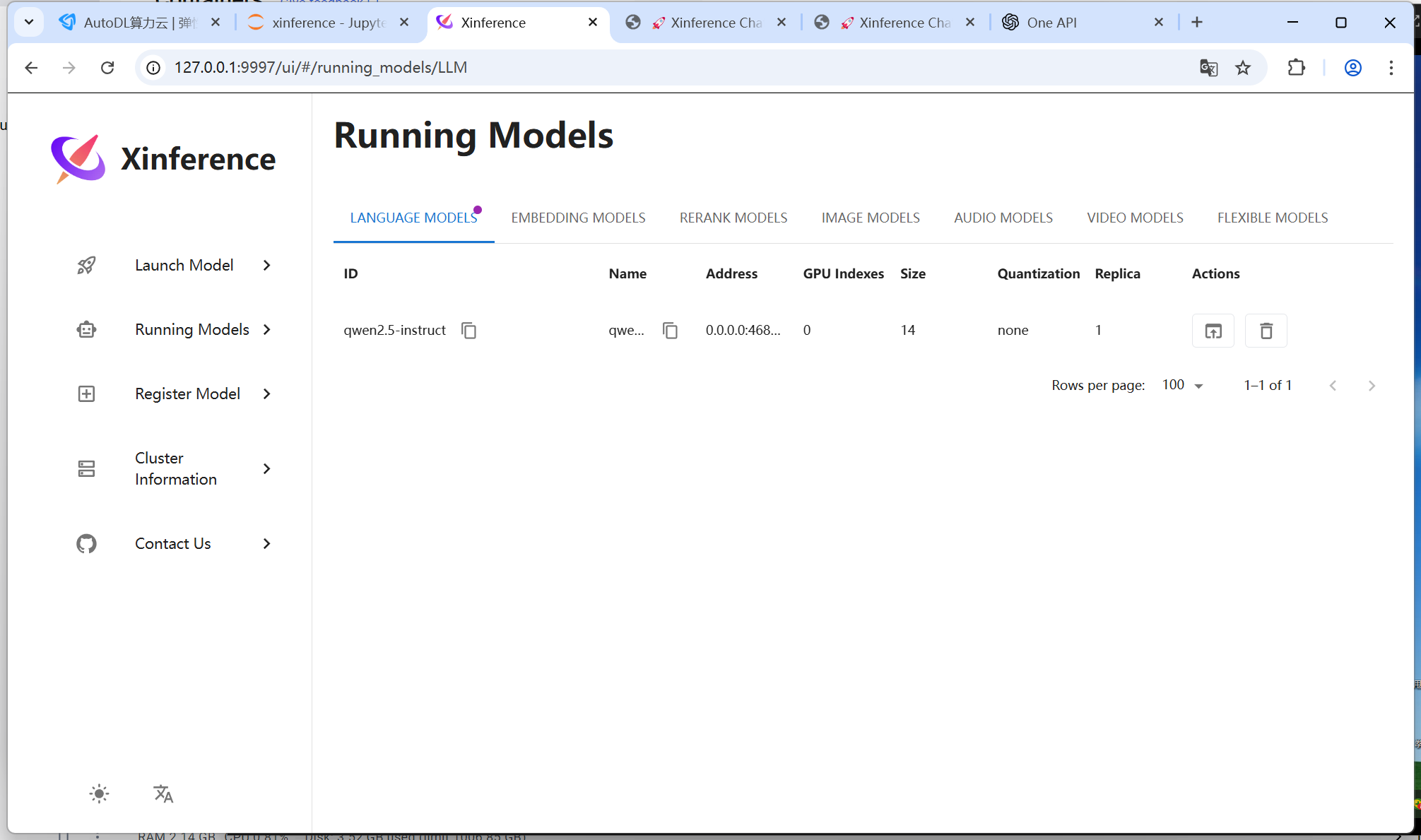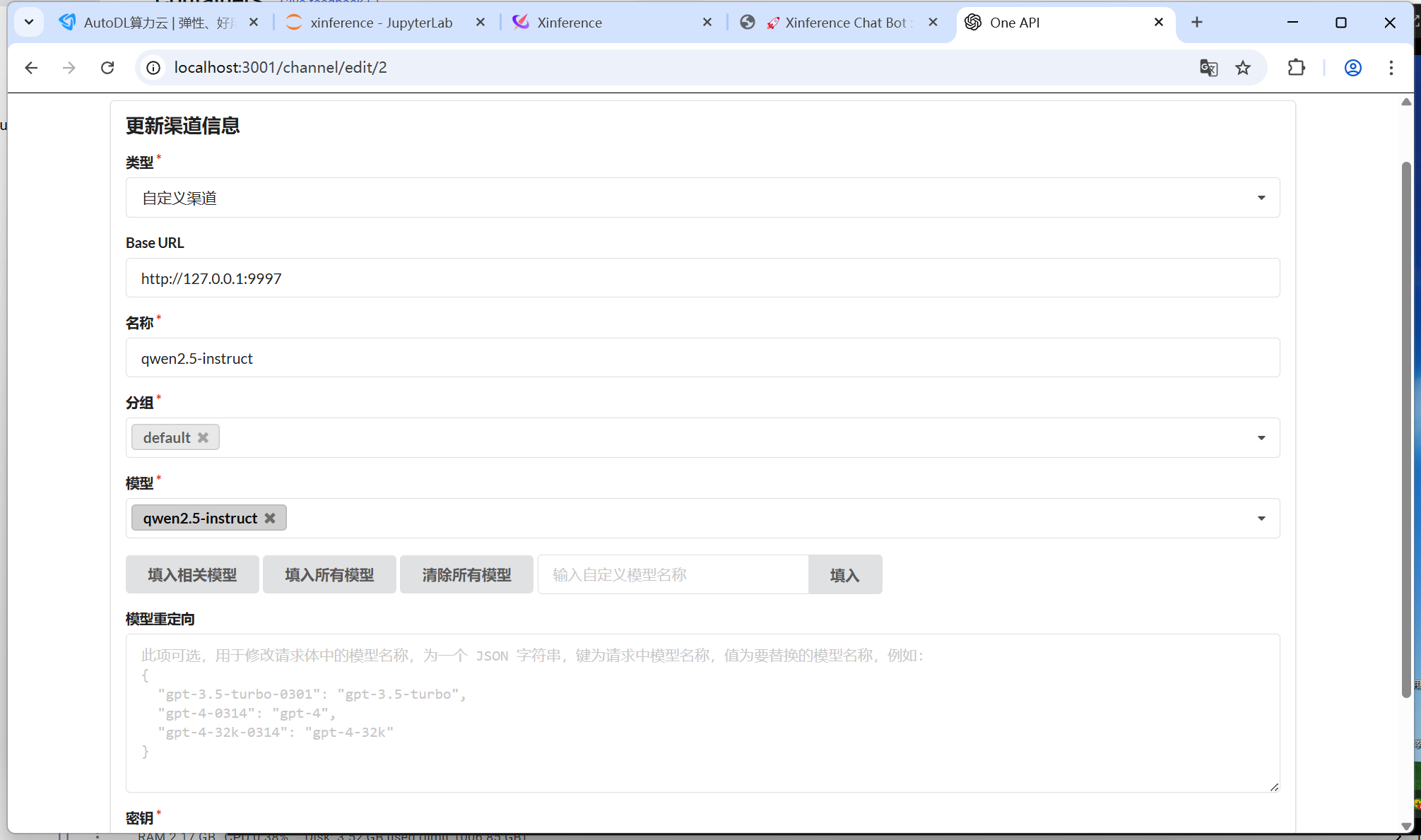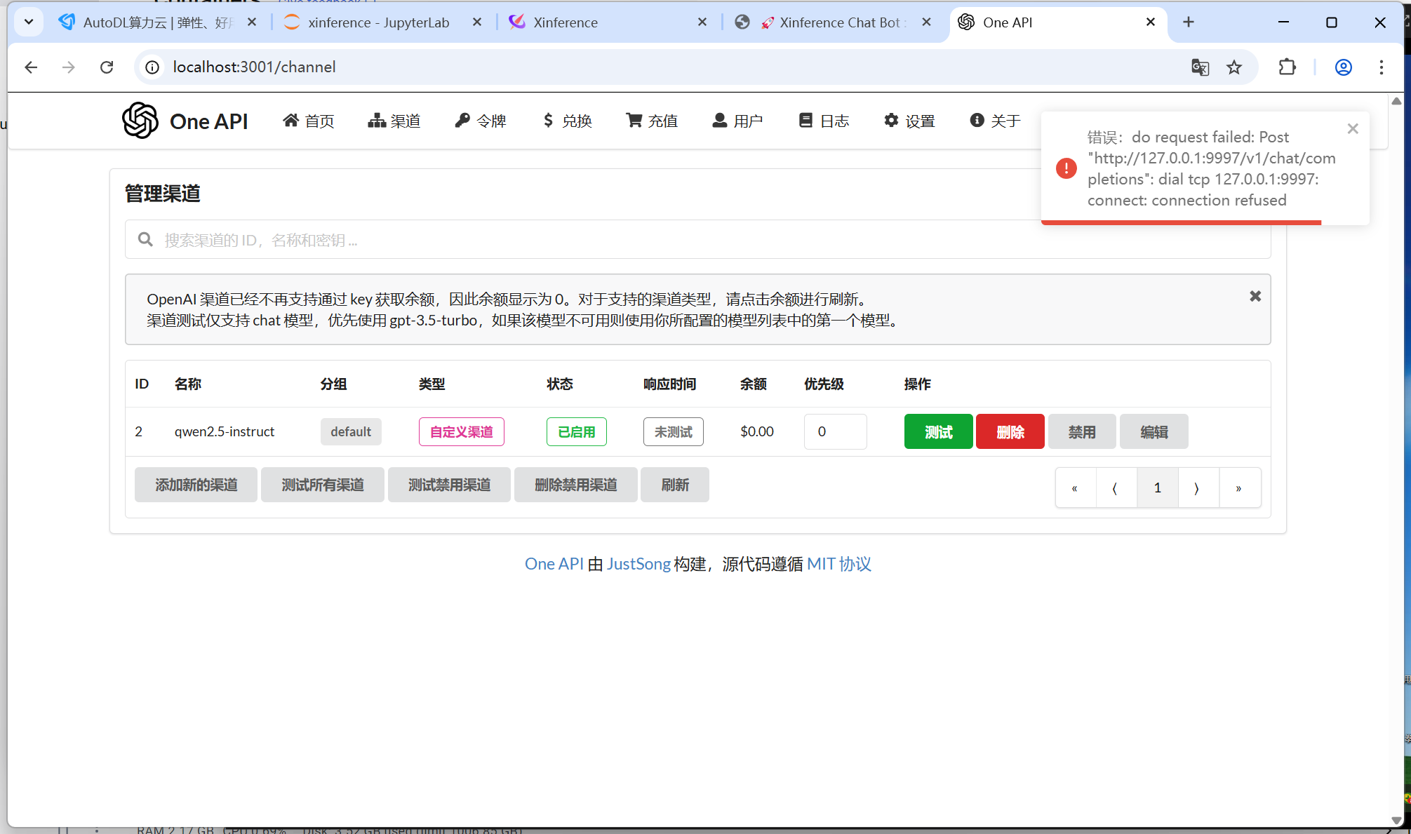在autodl上用xinference布署的模型qwen2.5-instruct,oneAPI配置连接不上。本地隧道已打通9997端口。看附件图。
