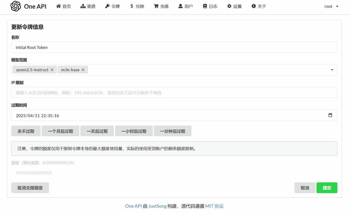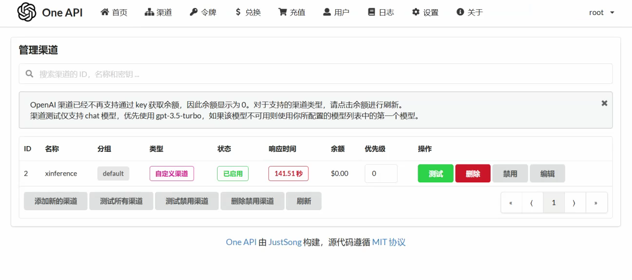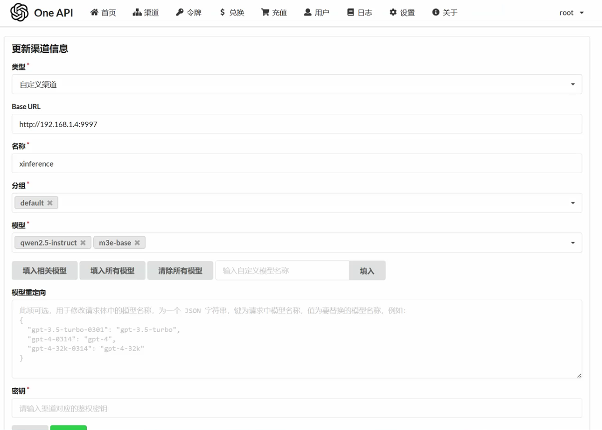 好的,看一下这个是oneAPI配置哦。 渠道是可以通的,有转发过去。不然autodl上的xinference也不会报错。