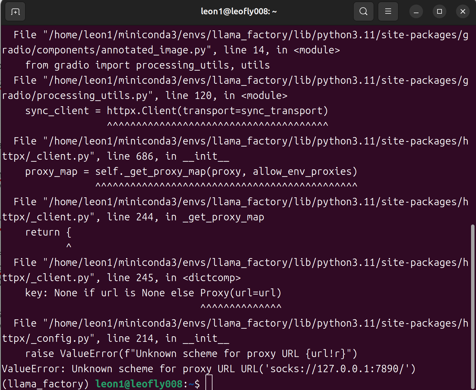 老师,当本地运行指令llamafactory-cli webui时会出现ValueError: Unknown scheme for proxy URL URL('socks://127.0.0.1:7890/')的提示,这是什么原因啊。