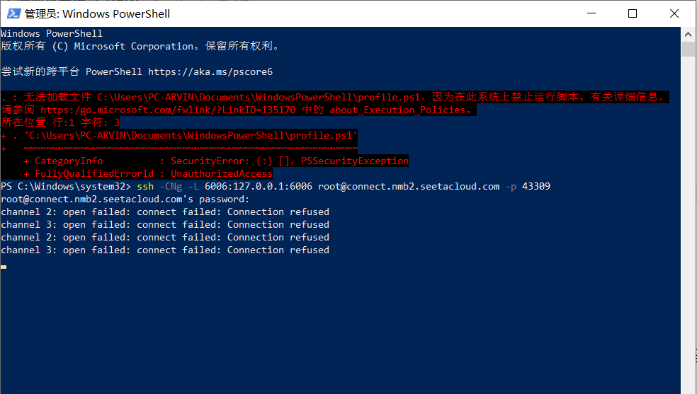 尝试用用powershell 中 用Luinx/Mac 方式连通,输入地址和密码后: 提示拒绝接入: