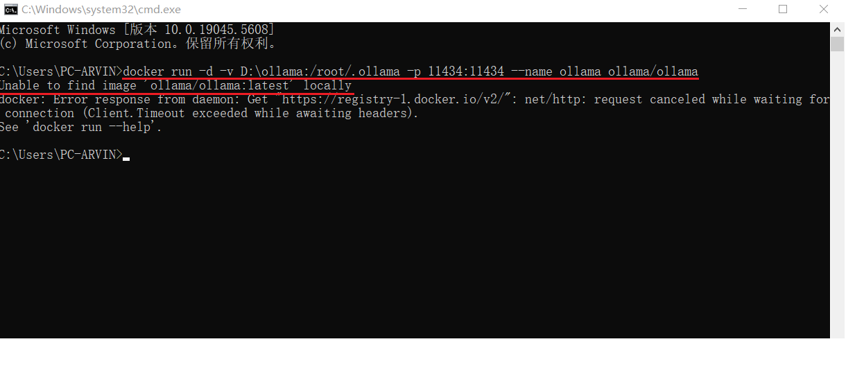 在本地命令行输入:docker run -d -v D:\ollama:/root/.ollama -p 11434:11434 --name ollama ollama/ollama