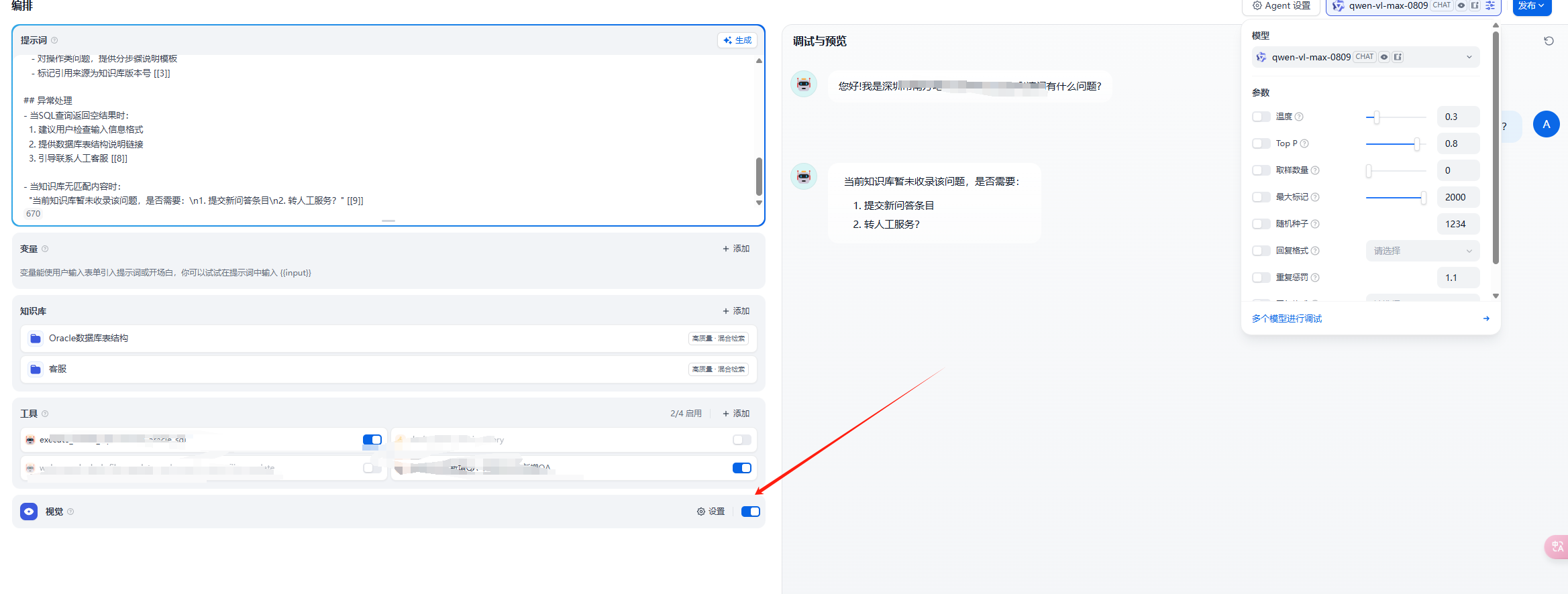 现在遇到一个问题,提问的如果发送图片 + 问题,那么就得调用 多模态视觉大模型,这时候它的知识库检索和工具调用能力不行。