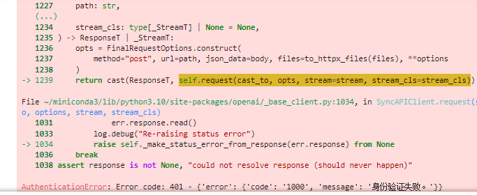 AuthenticationError: Error code: 401 - {'error': {'code': '1000', 'message': '身份验证失败。'}}