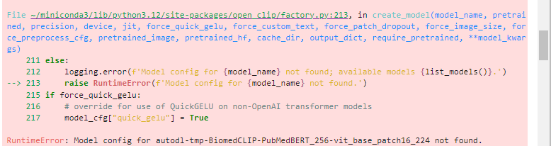RuntimeError: Model config for BiomedCLIP-PubMedBERT_256-vit_base_patch16_224 not found.
