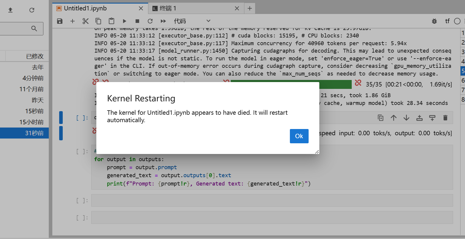 放在notebook中,outputs = llm.generate(prompts, sampling_params) 这行代码报错,如图2