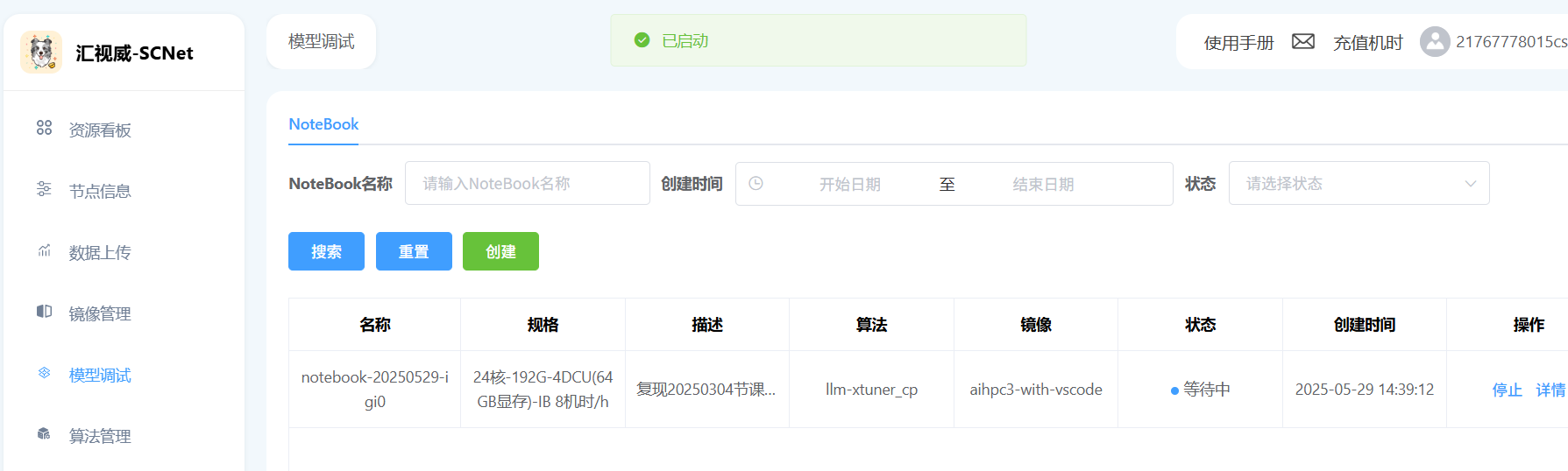 老师,请问下,在汇视威平台复现作业的时候,在模型调试里面,创建了一个notebook,自动停止那块仍然是默认的4小时,创建完notebook后我发现自动停止那块设置错了,然后我就删除了notebook,然后再新建任务,启动之后也是显示在等待中,没办法使用,是否需要等待4小时之后才可以使用啊,目前是这种状态