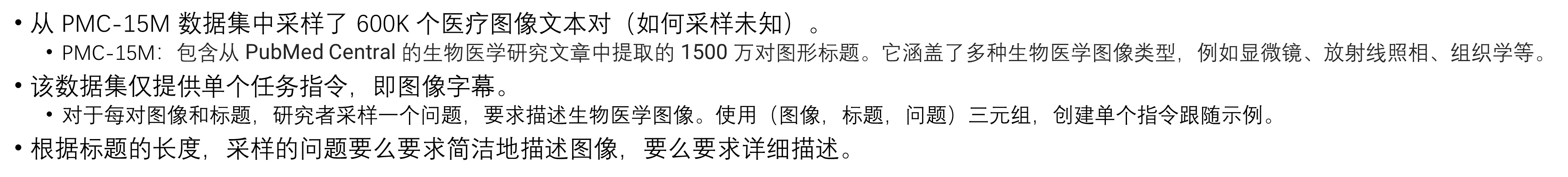 PMC-15M:包含从 PubMed Central 的生物医学研究文章中提取的 1500 万对图形标题。它涵盖了多种生物医学图像类型,例如显微镜、放射线照相、组织学等。该数据集仅提供单个任务指令,即图像字幕。对于每对图像和标题,研究者采样一个问题,要求描述生物医学图像。使用(图像,标题,问题)三元组,创建单个指令跟随示例。根据标题的长度,采样的问题要么要求简洁地描述图像,要么要求详细描述。