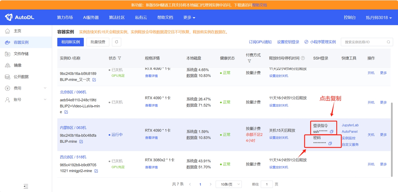 有的同学在这一步是直接复制了老师进行隧道设置的代码。需要清楚这里可能每个人都是不一样的,服务器会通过不同的端口来为我们提供ssh服务。我们需要查看自己在AutoDL服务器上的端口号。这里以我自己的实际情况举例: