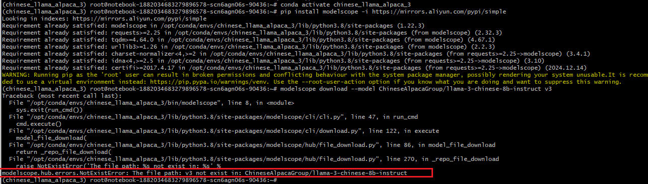 依次输入命令为: conda activate chinese_llama_alpaca_3 pip install modelscope -i https://mirrors.aliyun.com/pypi/simpl…
